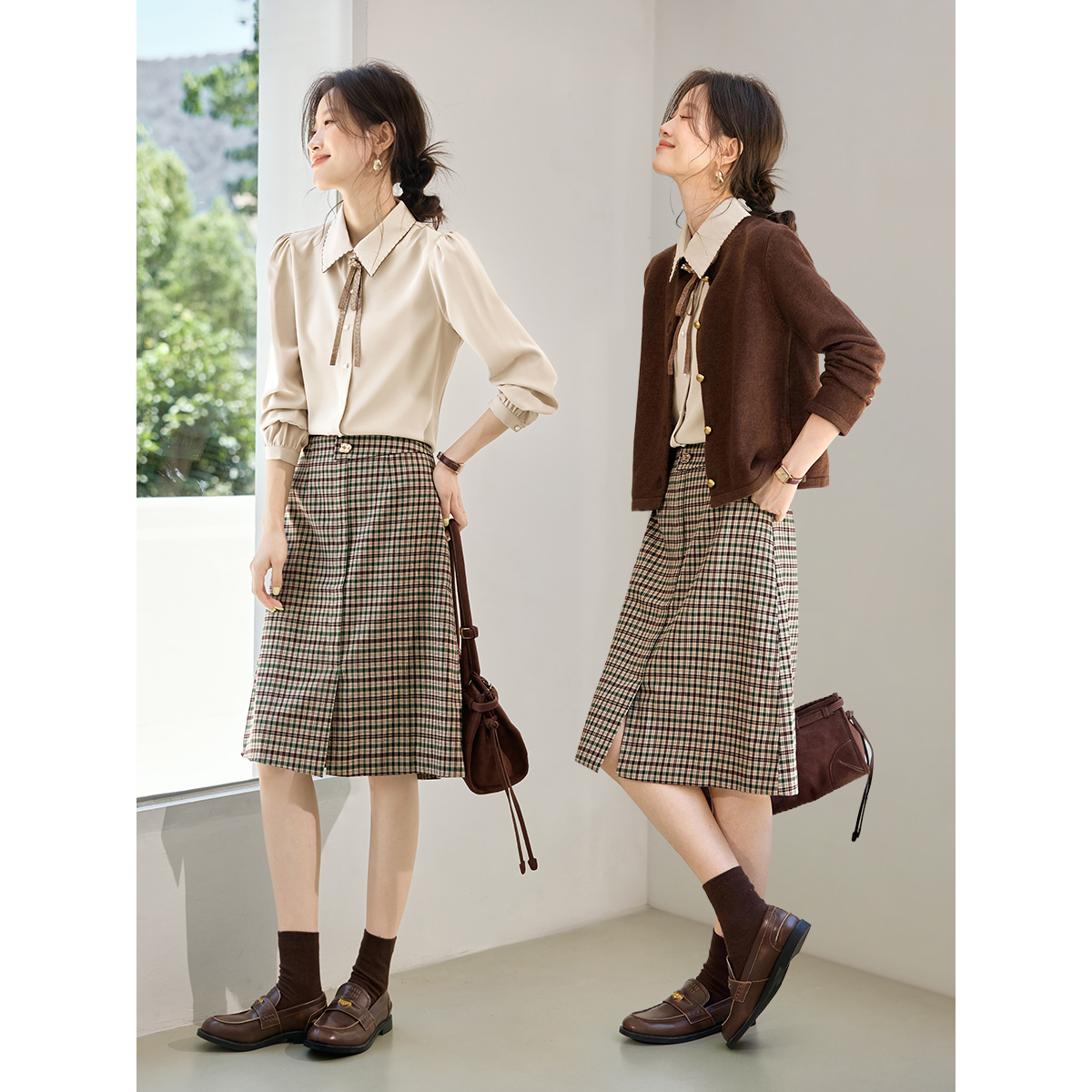 沫晗依美质感格子裙套2025秋季新款简约通勤气质衬衫半身裙女套装