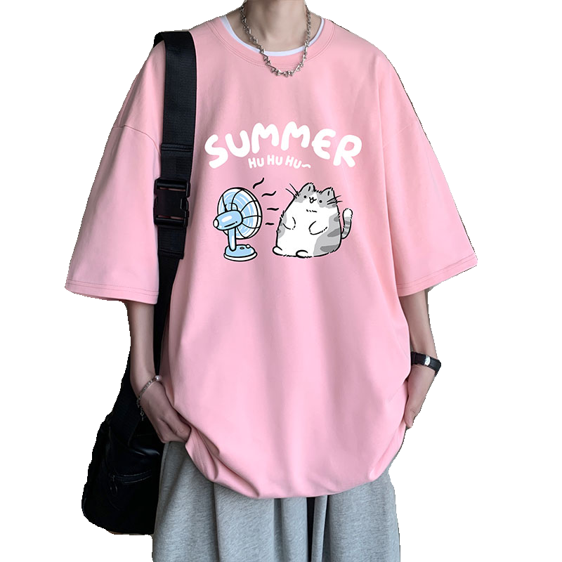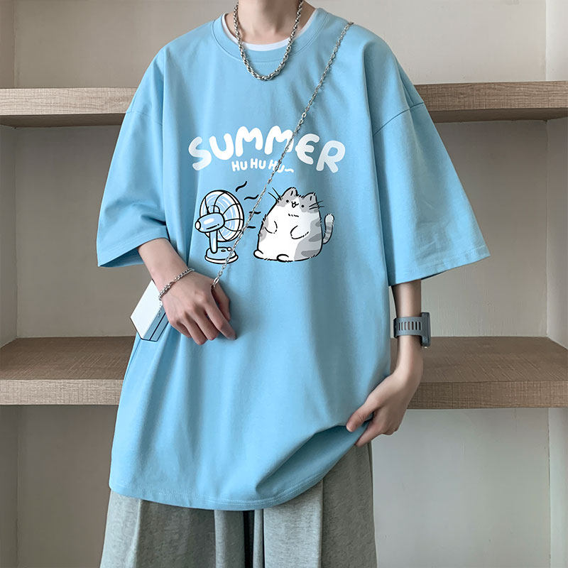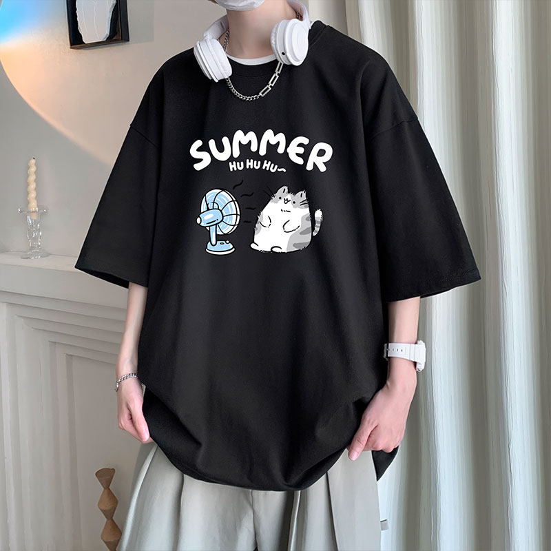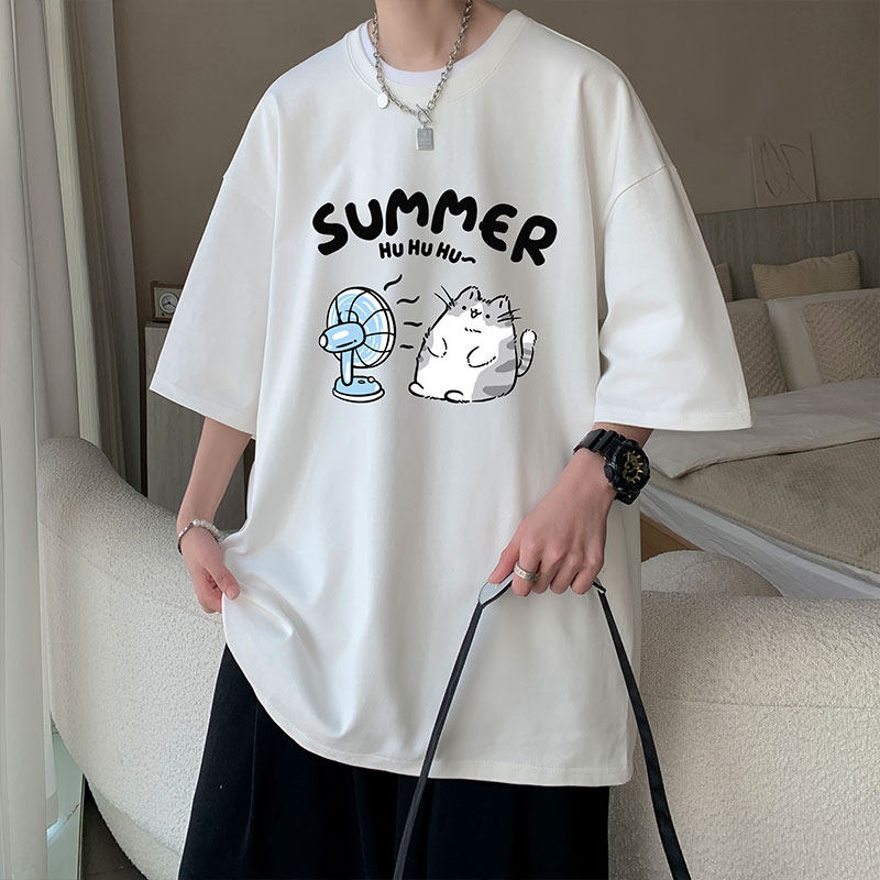 短袖T恤男生夏季复古卡通宽松小领口五分上衣oversize大码半截袖