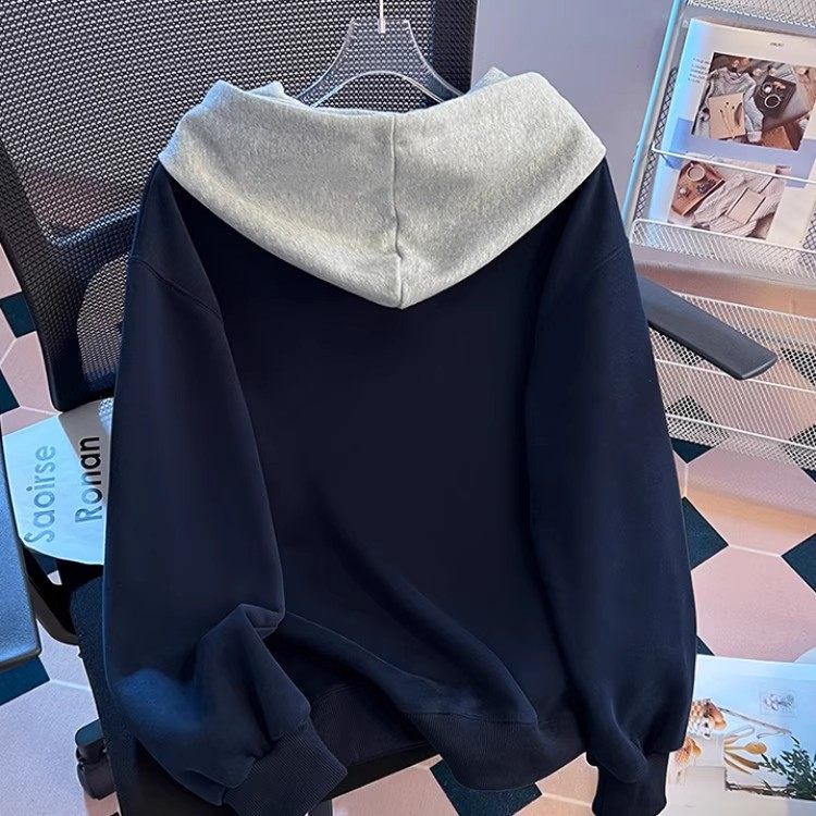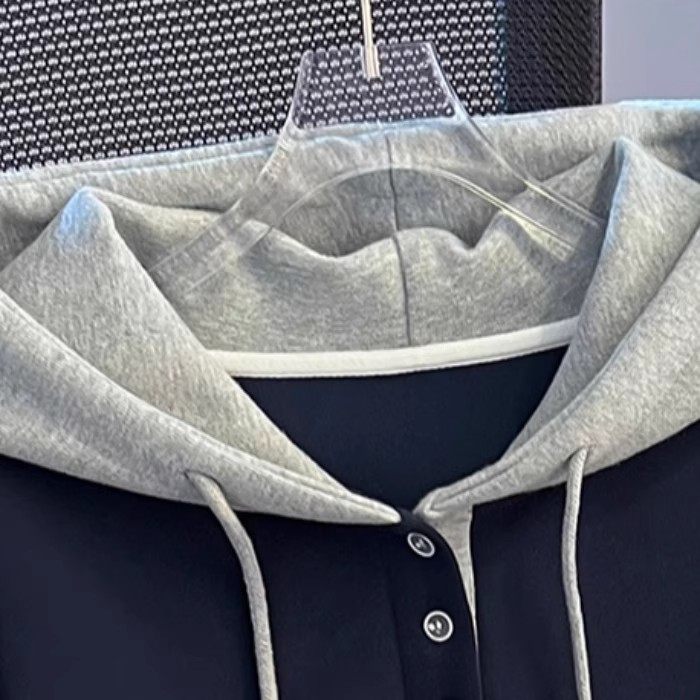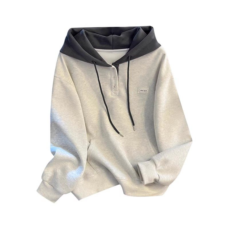 2025秋冬季新款韩版慵懒宽松显瘦单排扣设计感撞色长袖连帽卫衣女