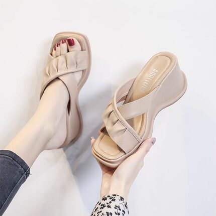 高跟拖鞋女夏时尚外穿2025春夏新款真皮厚底一字拖舒适坡跟凉拖女