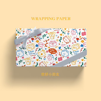你好小朋友可爱手绘卡通礼物包装纸大尺寸新年情人节儿童生日伴手礼盒礼品纸高级感花束打包丝带DIY包书皮纸