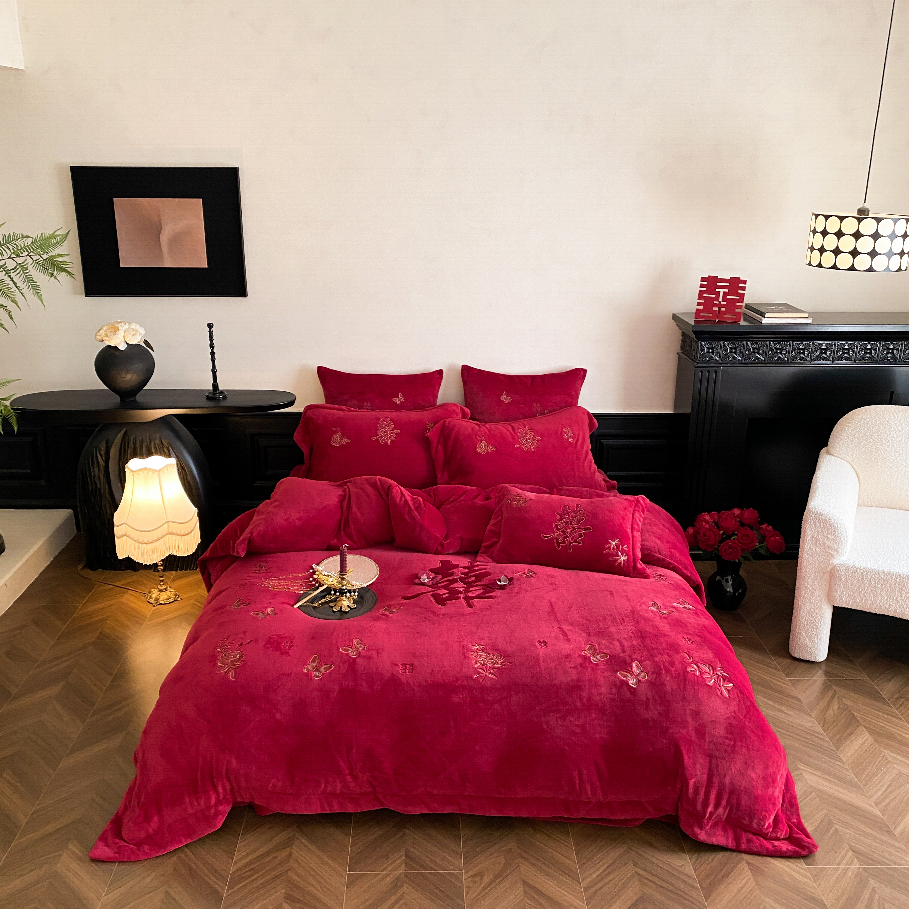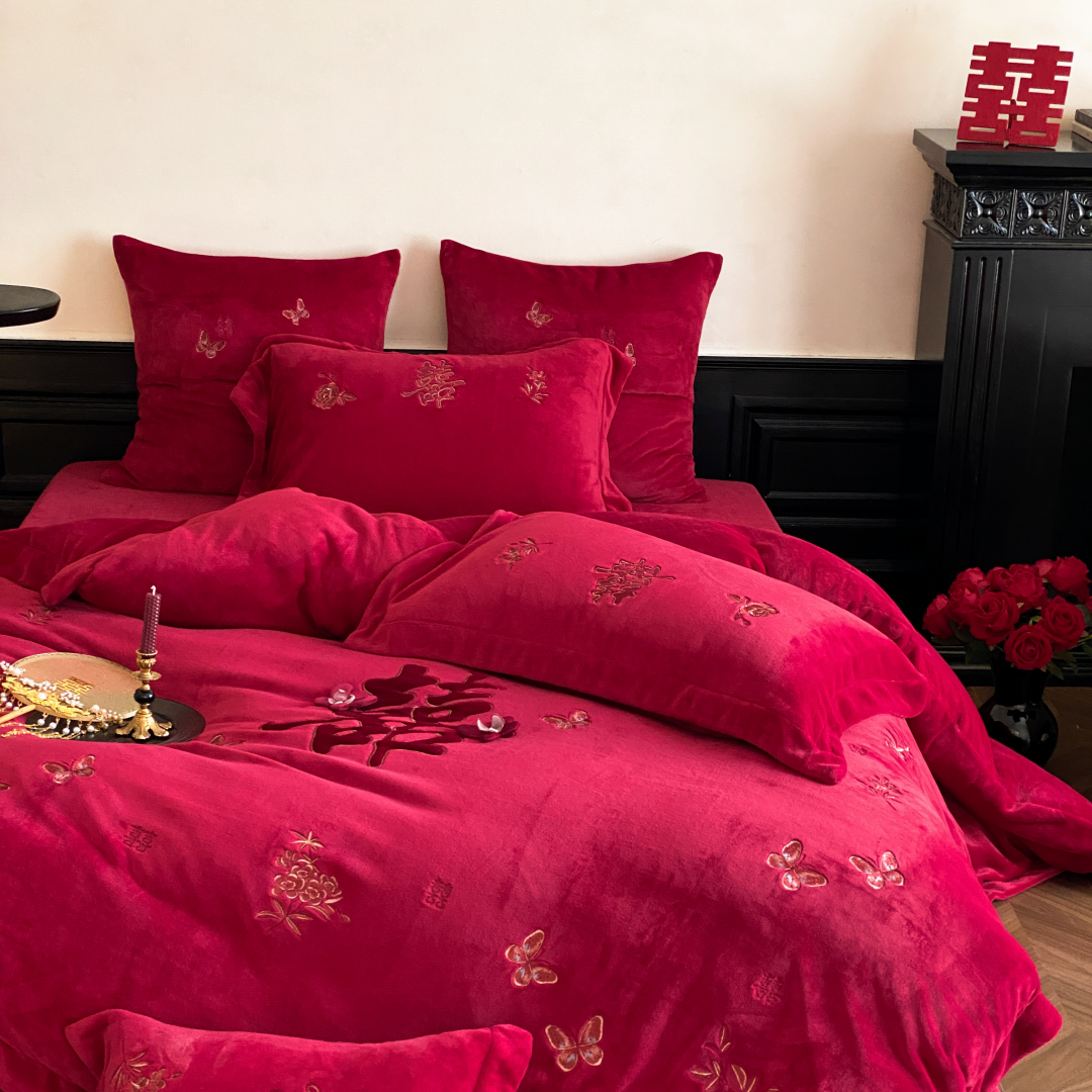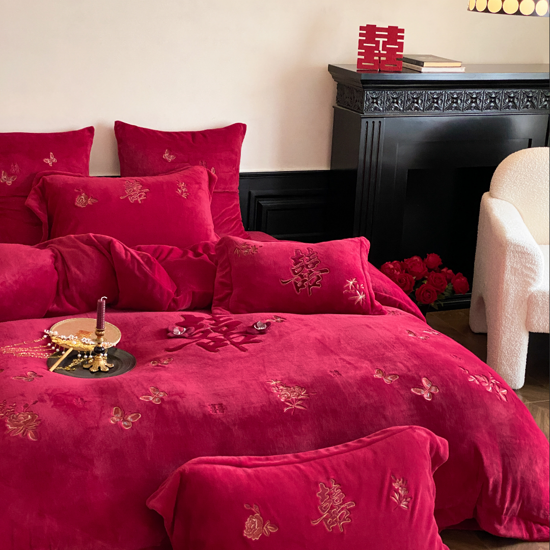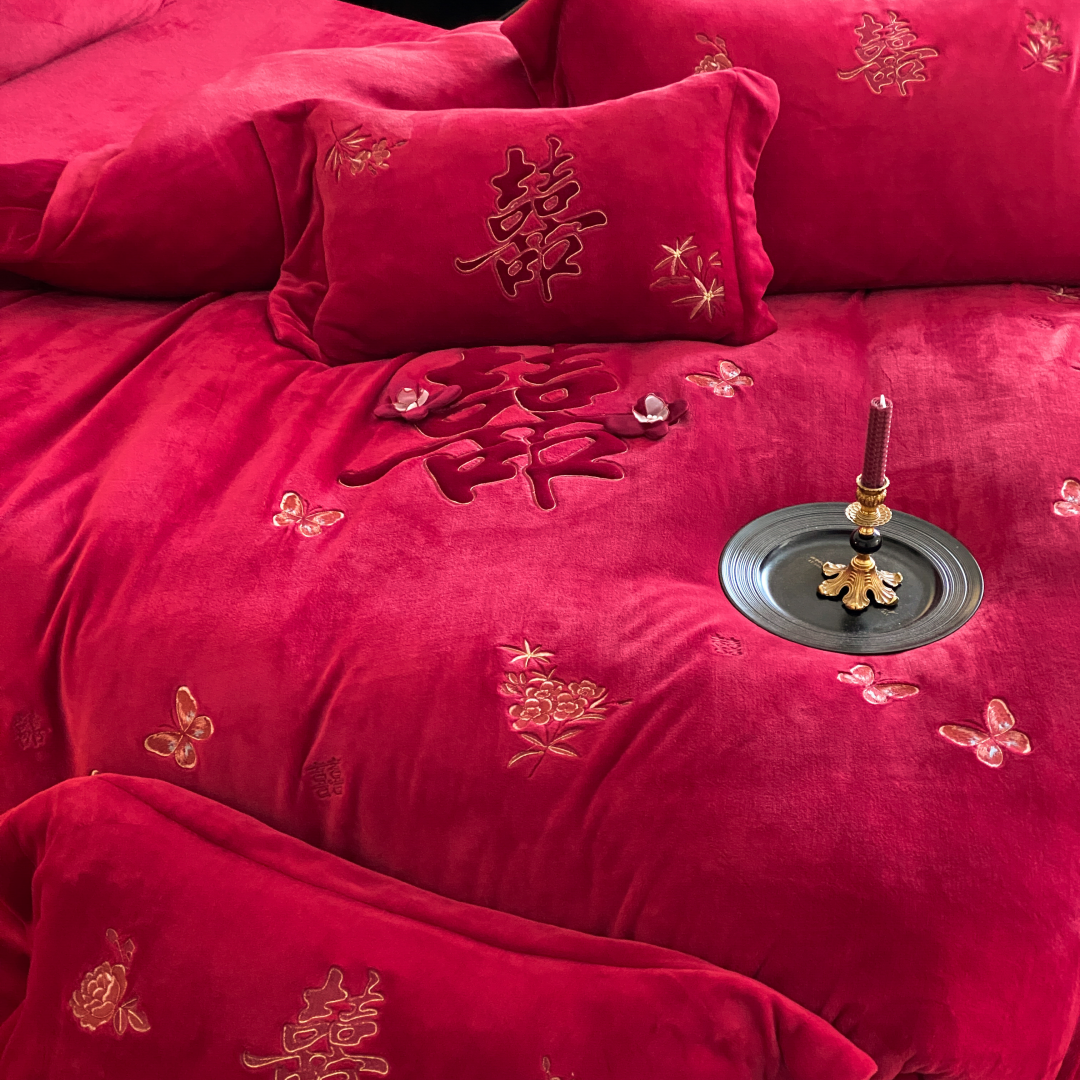 冬季婚庆加厚牛奶绒四件套双喜刺绣保暖珊瑚绒喜被套结婚床上用品