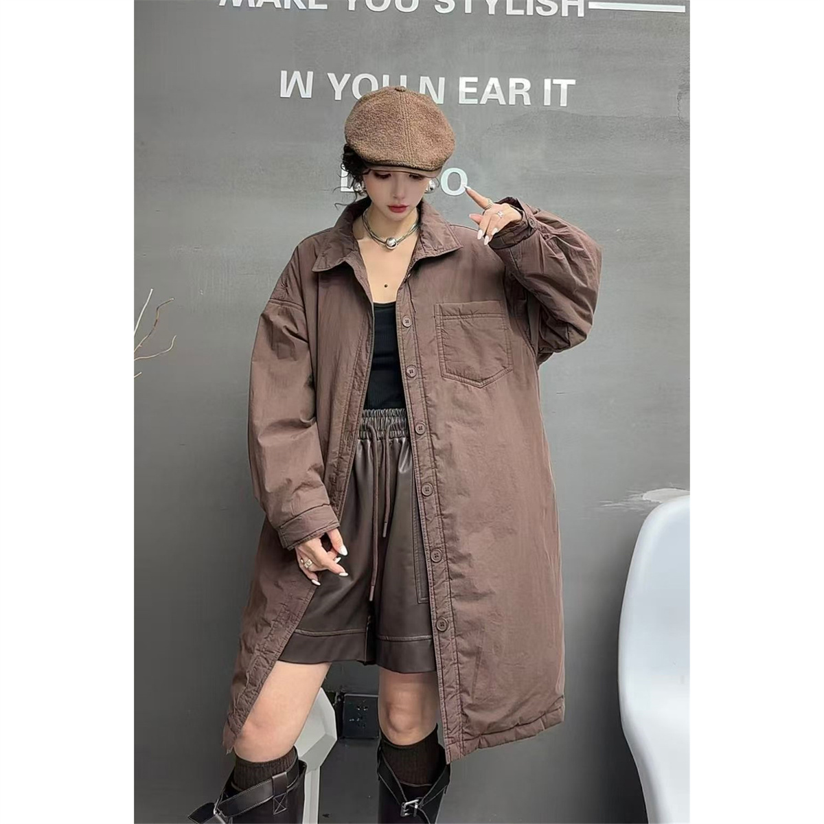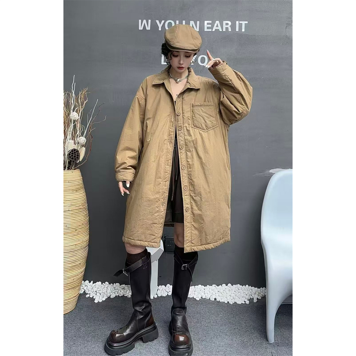 冬季新款文艺百搭纯色加厚棉服女宽松显瘦中长款翻领棉衣外套女