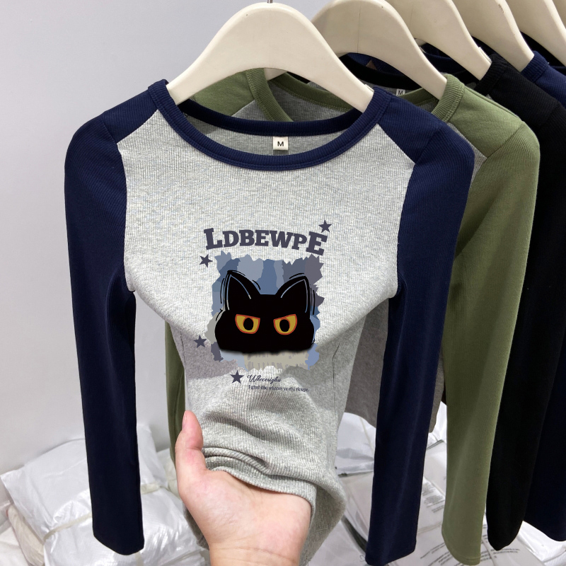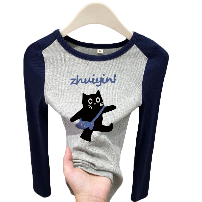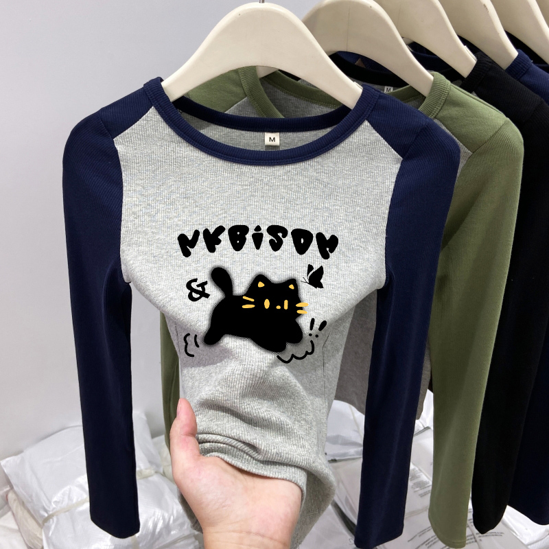撞色拼接纯棉长袖T恤女秋冬季加绒修身辣妹内搭打底衫上衣可外穿