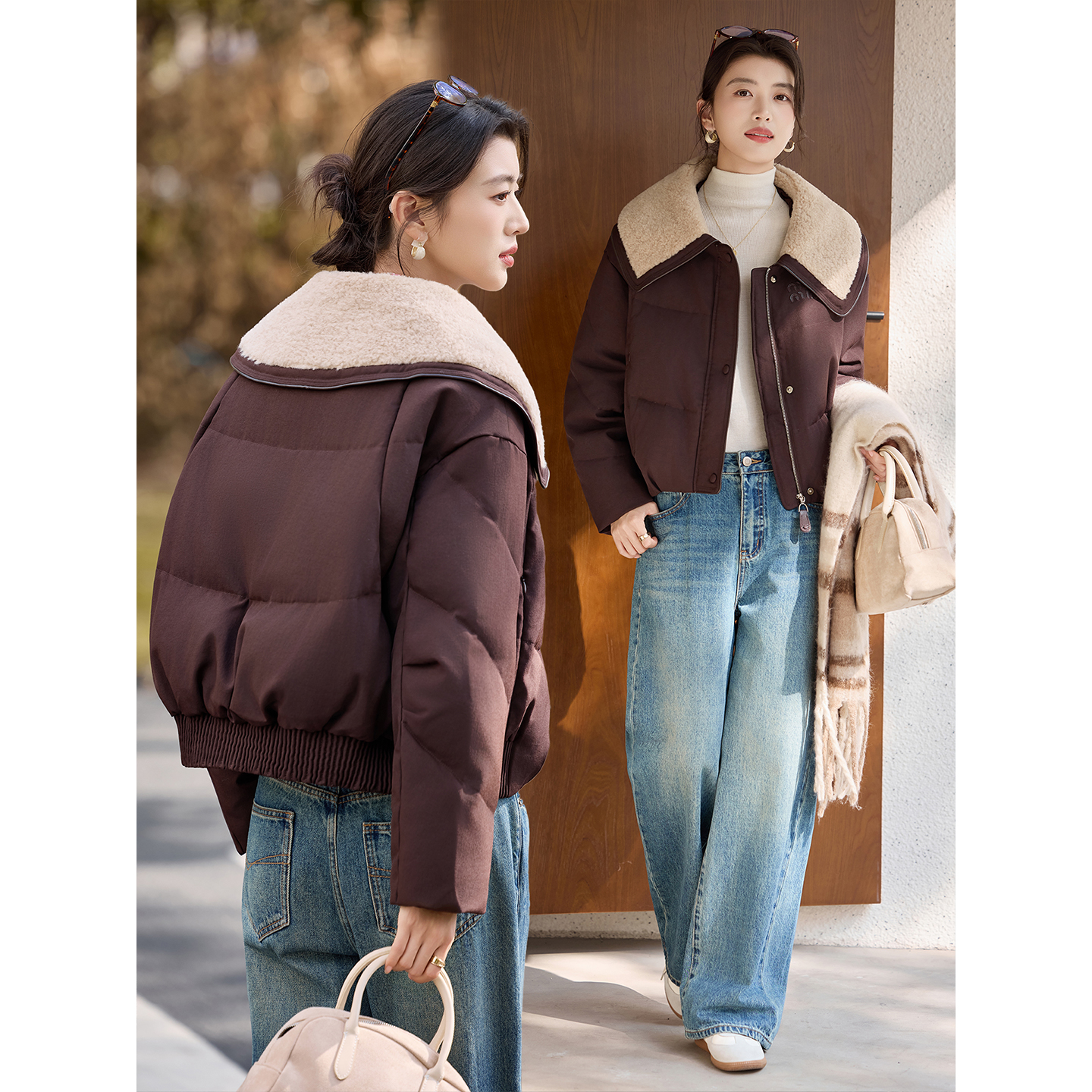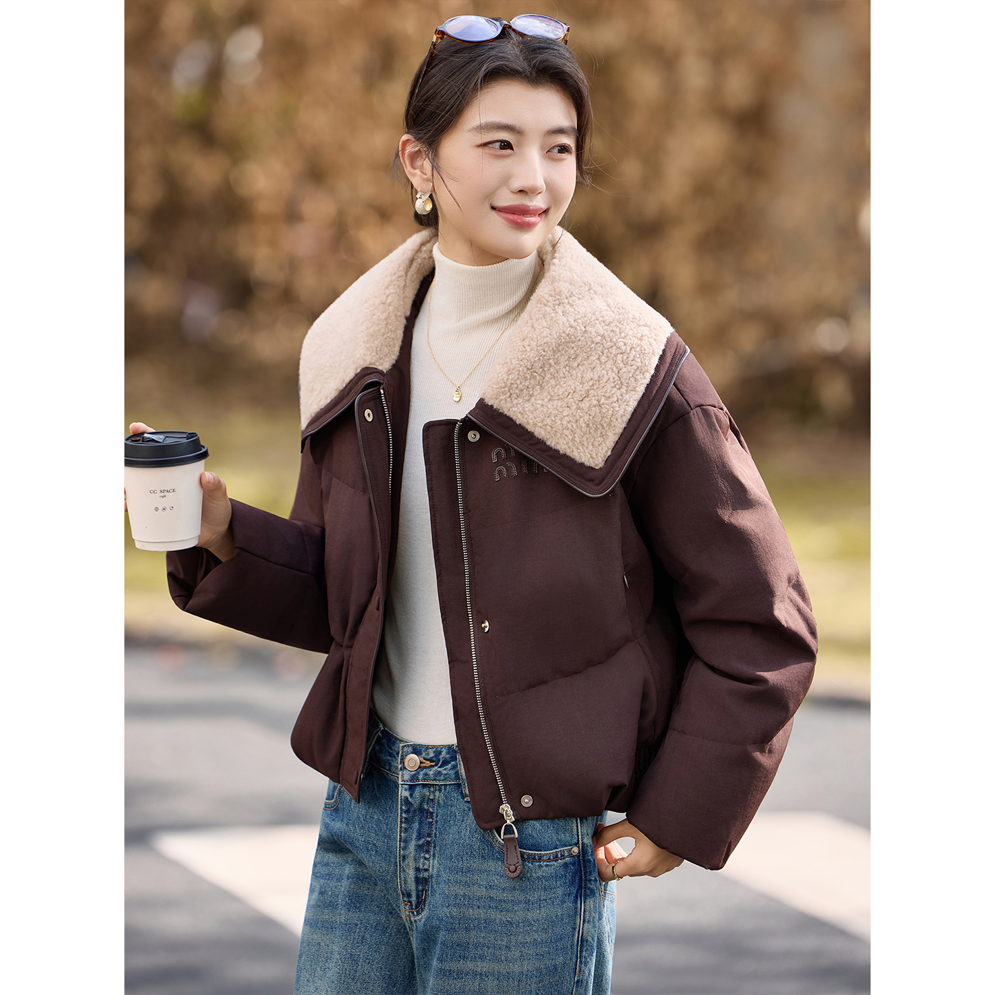 美拉德复古咖色绗线鹅绒羽绒服冬季新款羊羔毛翻领设计感短款外套