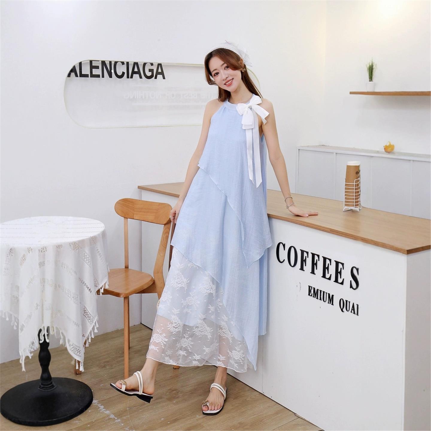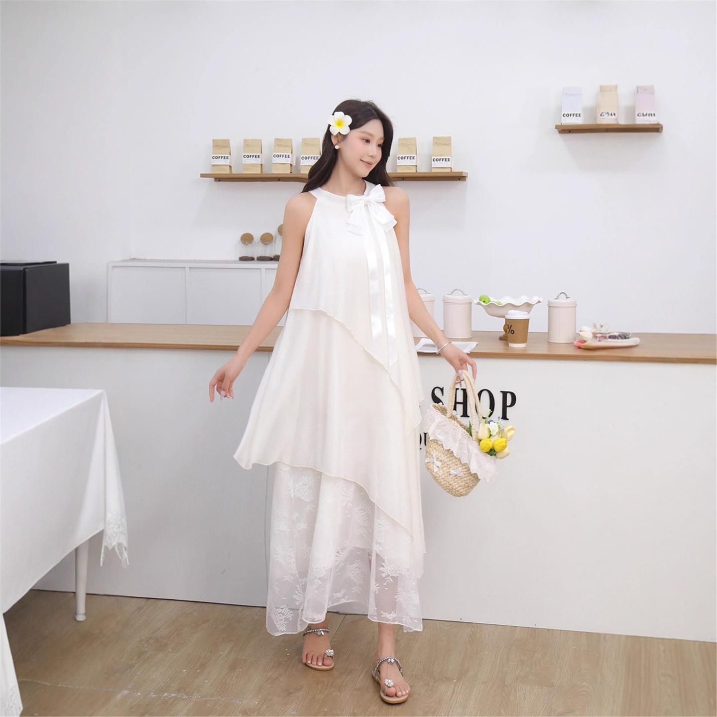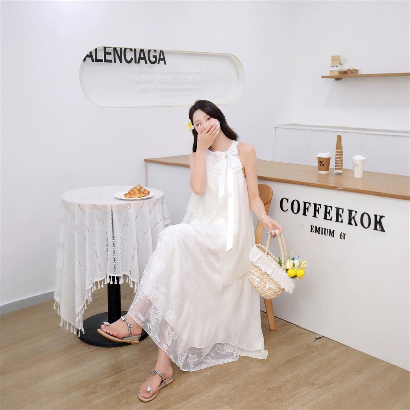 2025夏季新款韩系休闲浪漫长裙大蝴蝶结挂脖不规则连衣裙