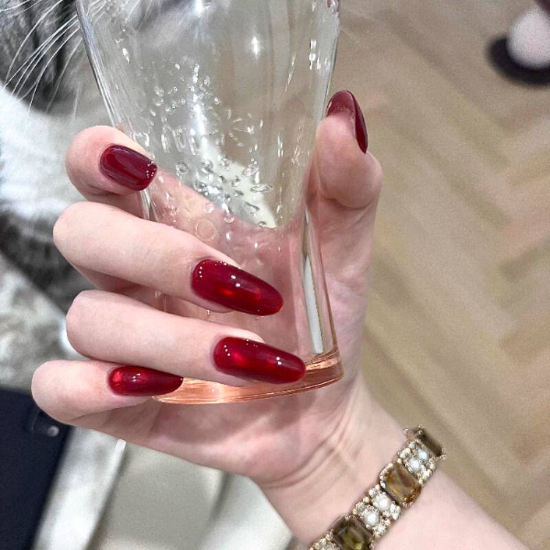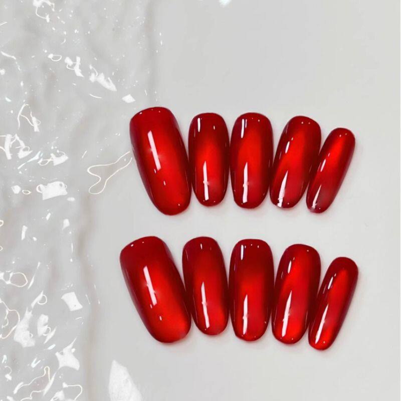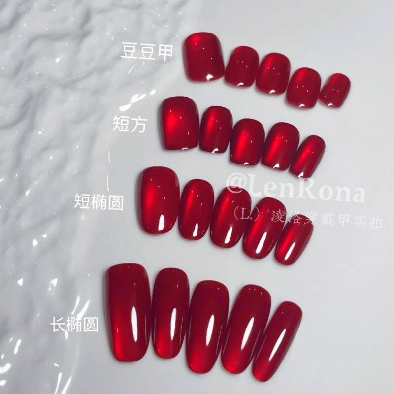 春节过年秋冬显白新年车厘子猫眼手工穿戴甲美甲贴红色豆豆椭圆