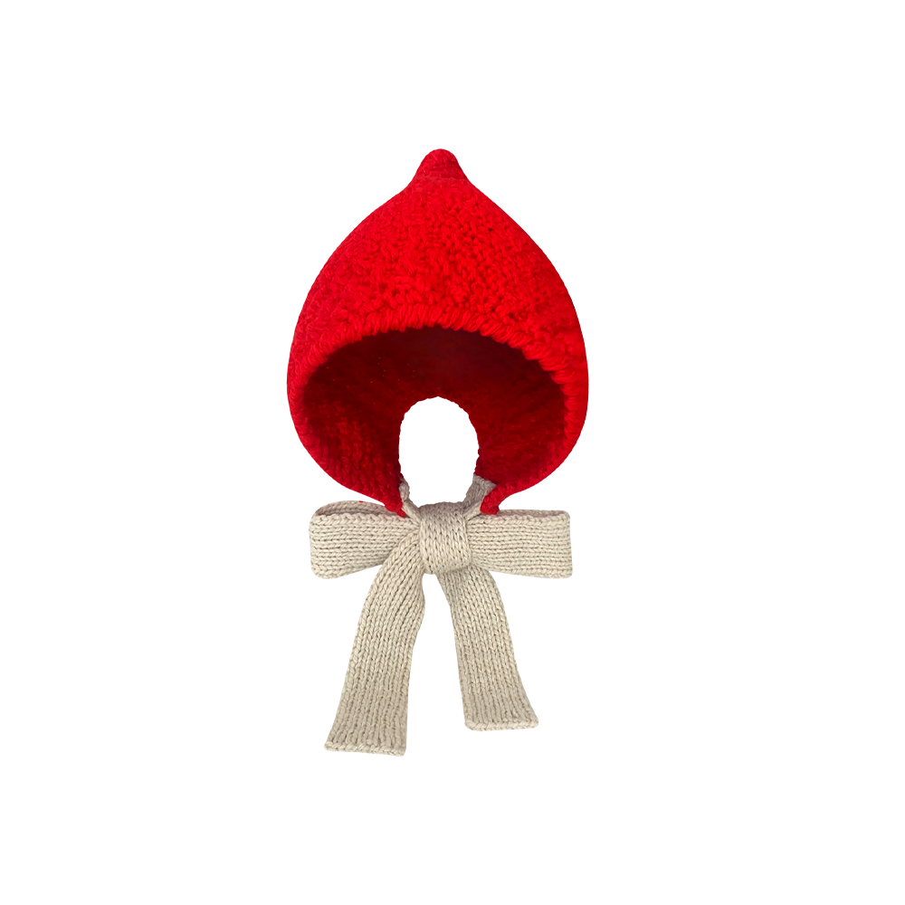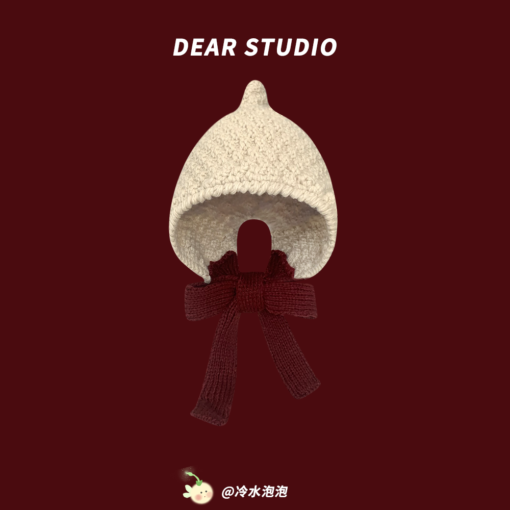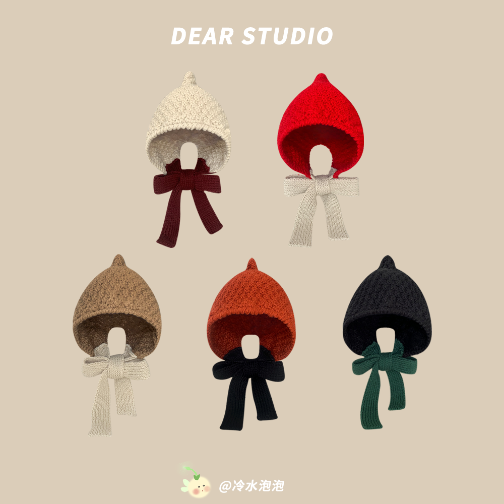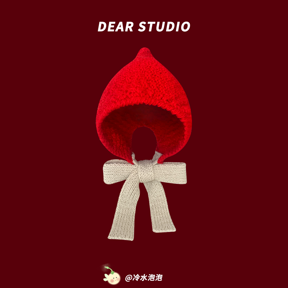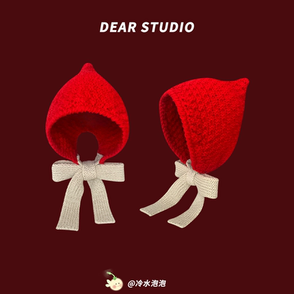 韩版手工针织系带红色包头帽子女秋冬季保暖百搭毛线帽骑车护耳帽