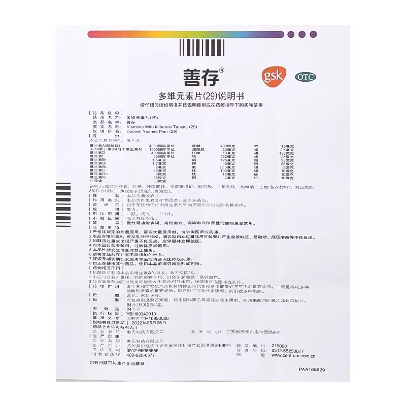 善存 多维元素片(29) 91片*2瓶 预防治疗维生素矿物质成人正品