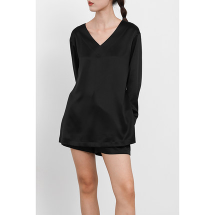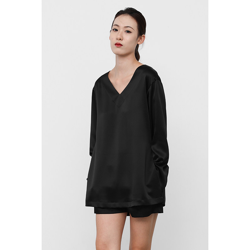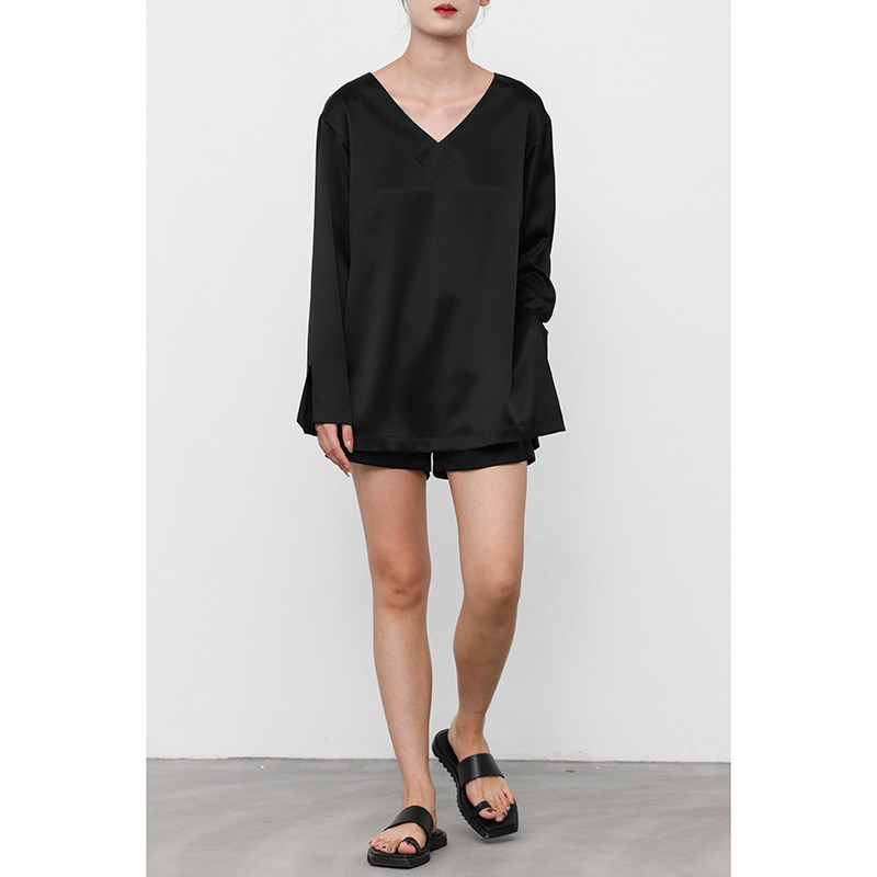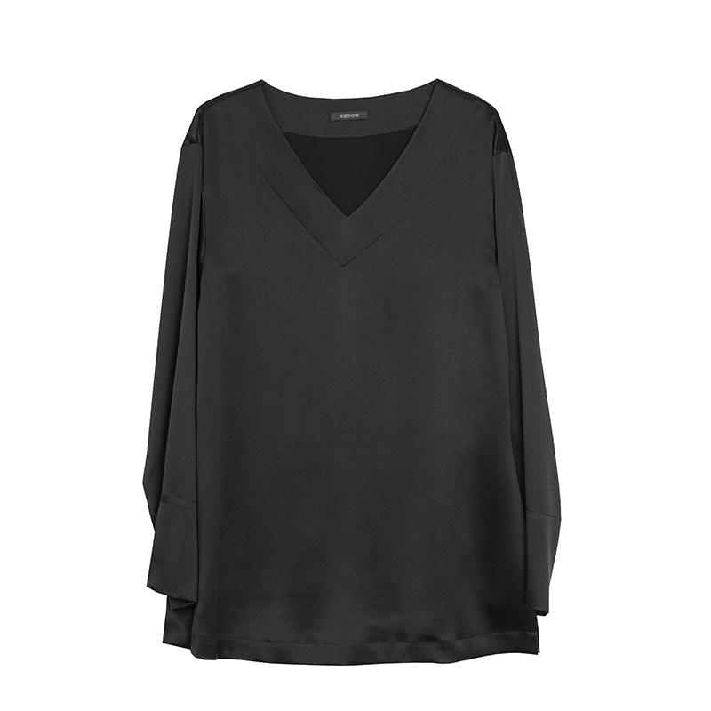 JUZININE原创设计黑色真丝衬衫V领长袖收腰冷淡风极简侧开衩上衣