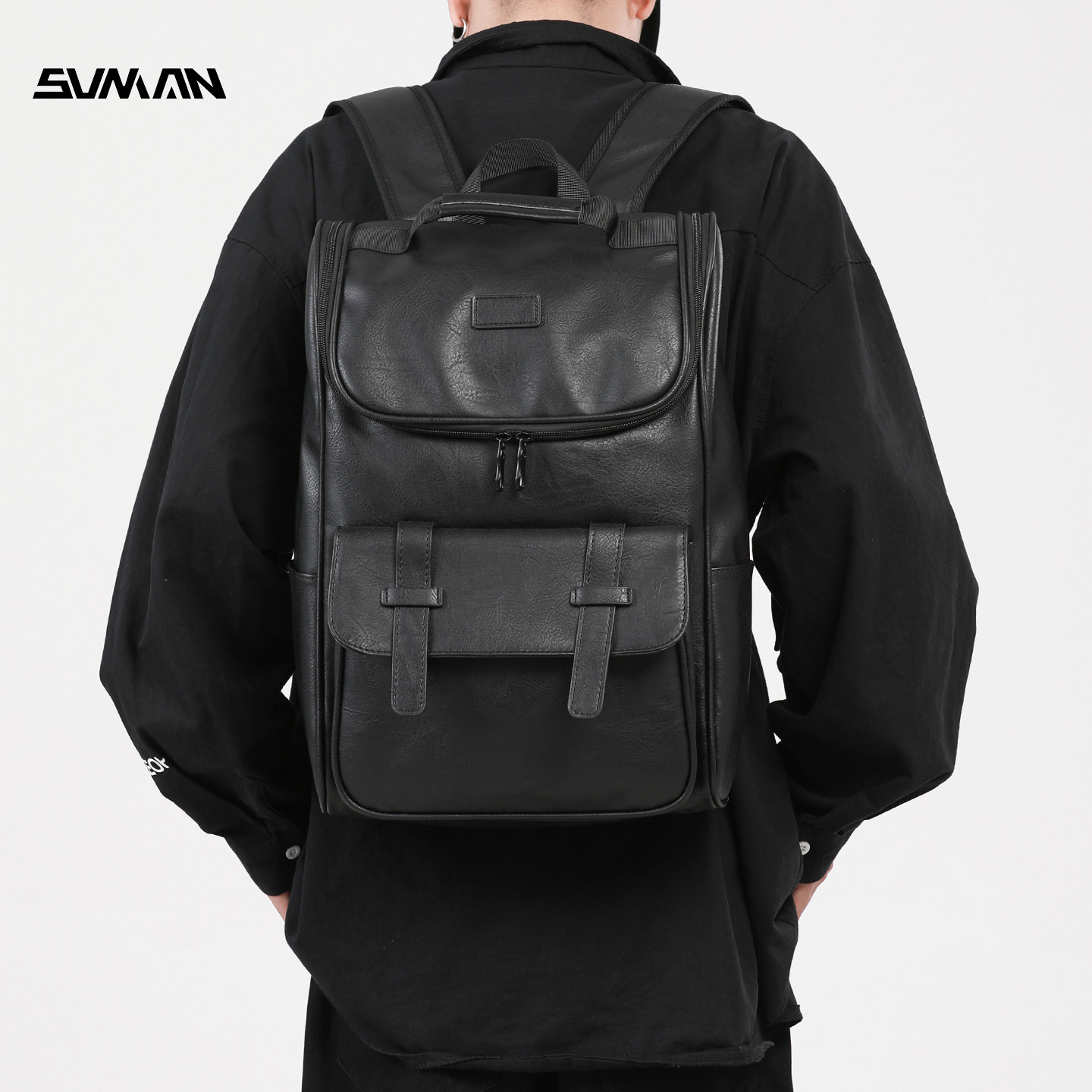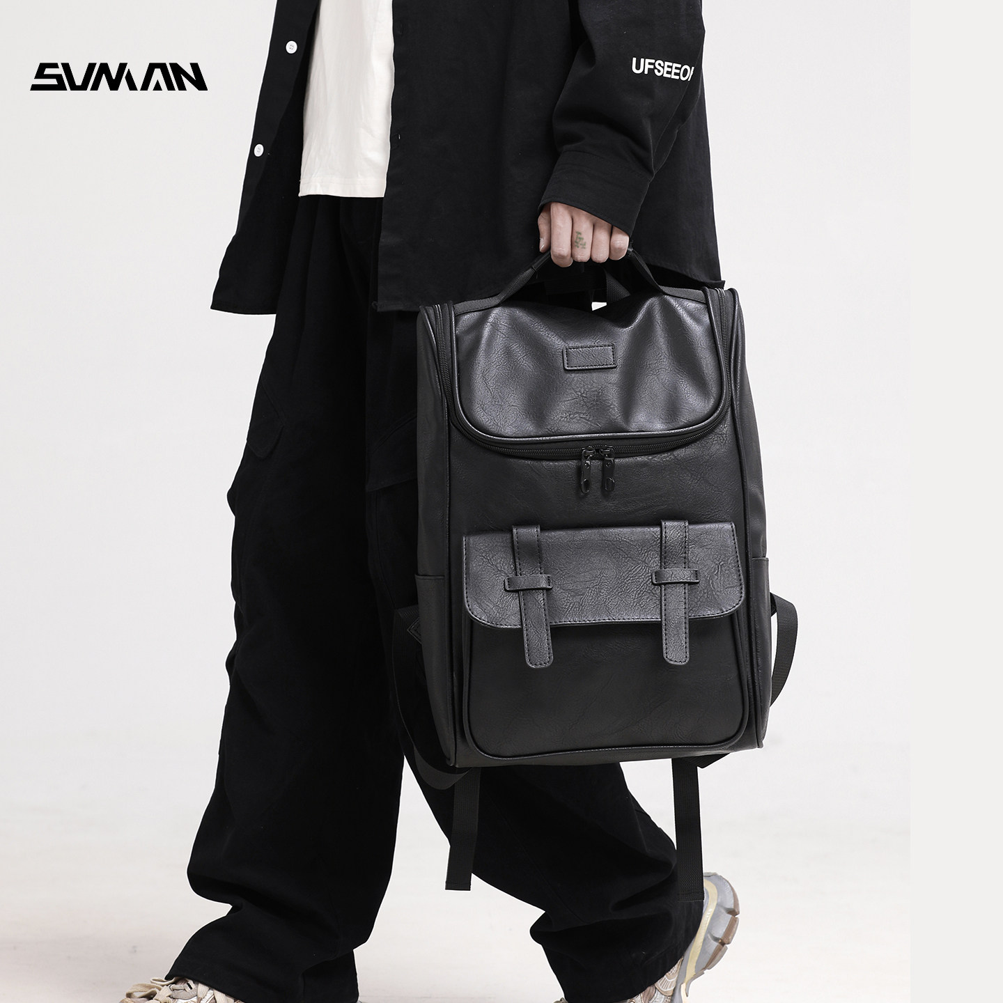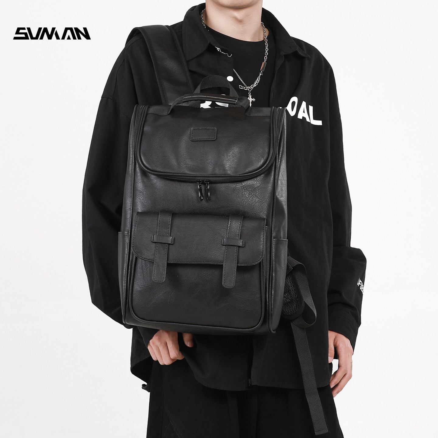 潮牌双肩包男款PU皮质通勤男士高级感16寸电脑背包商务大容量书包