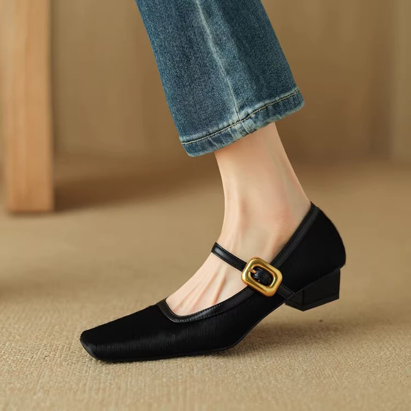 复古马毛方头粗跟单鞋女2025春季新款时尚豹纹中跟一字带玛丽珍鞋