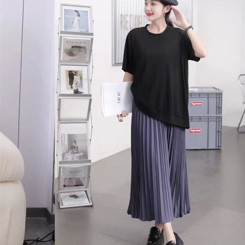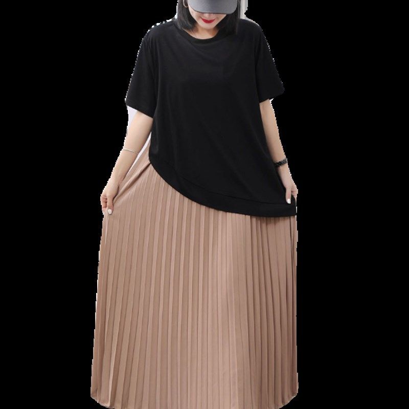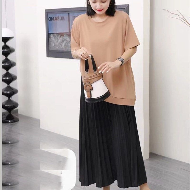 夏装新款2024大码短袖中长款连衣裙女宽松显瘦拼接撞色清新气质裙