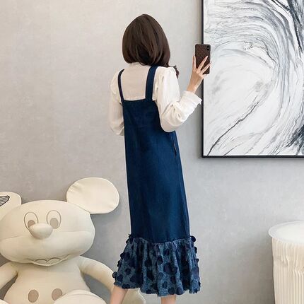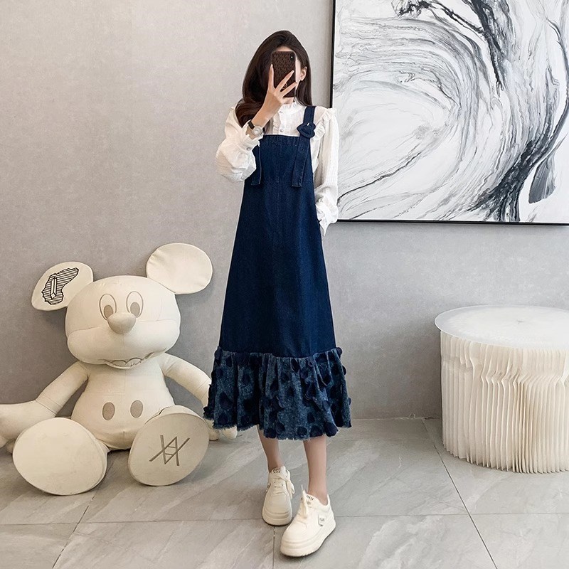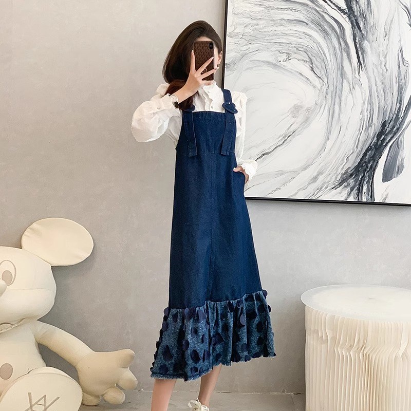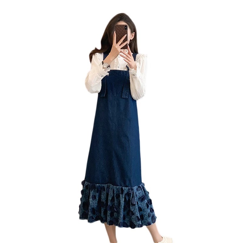蓝色牛仔背带连衣裙女2025年早春季新款背心鱼尾连身裙吊带长裙子
