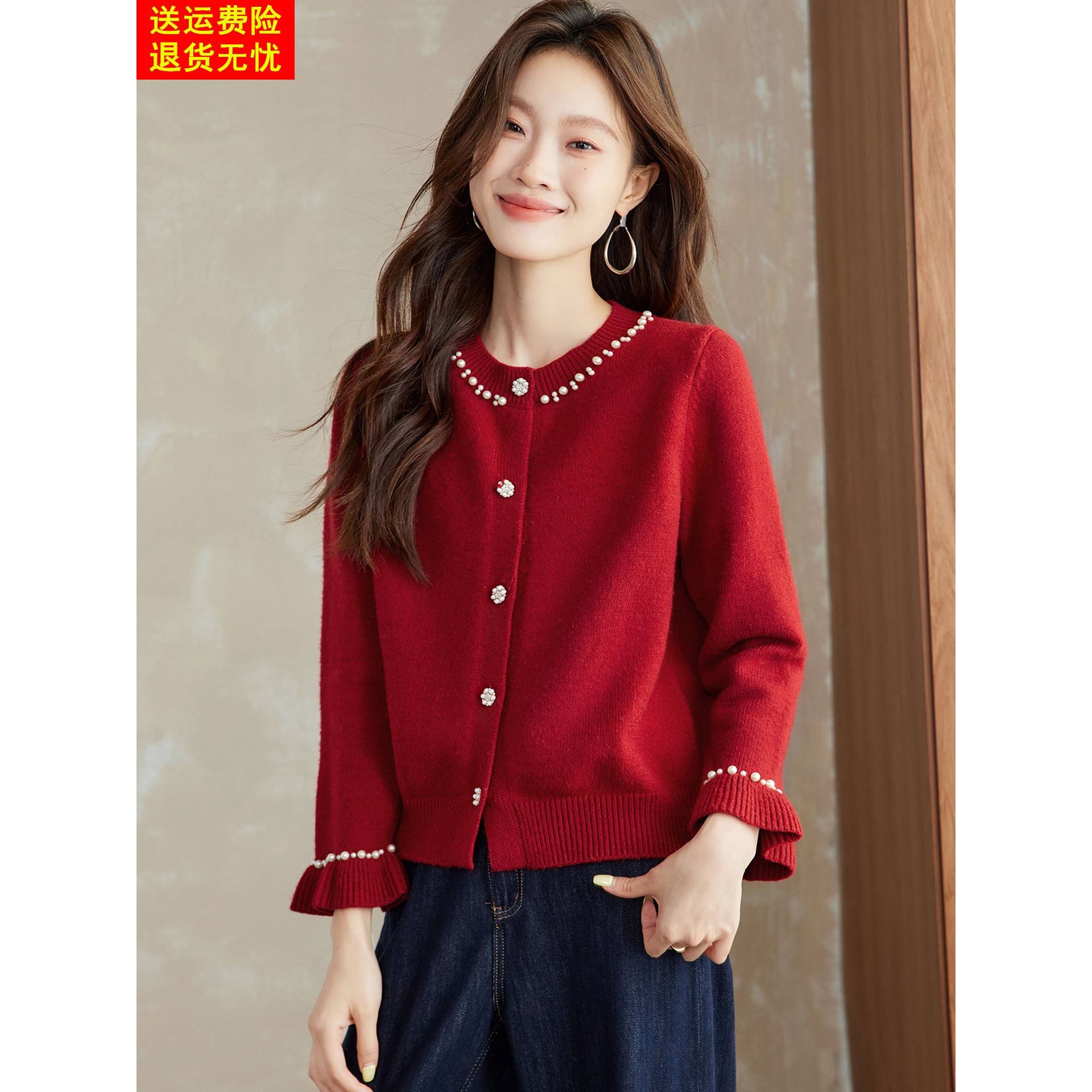 法式小香风红色钉珠针织开衫女秋季2025新款短款外套减龄气质上衣