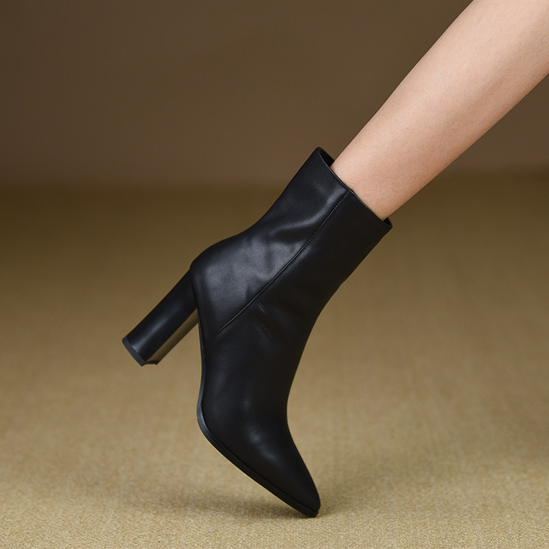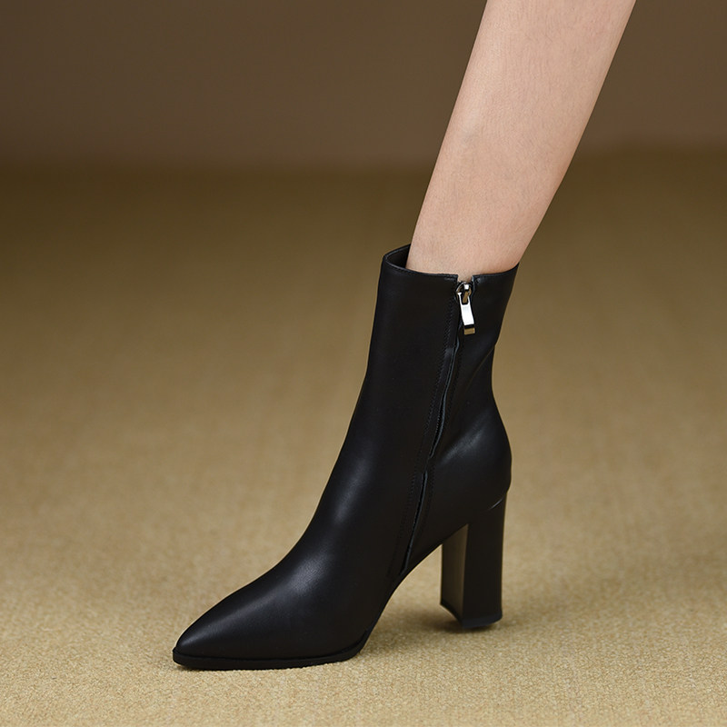 misili时装靴粗跟尖头真皮短靴