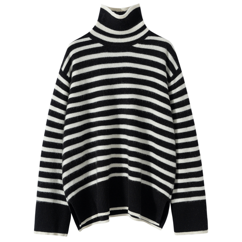 2025秋冬新款条纹高领羊绒衫女宽松慵懒风毛针织打底衫加厚羊毛衫
