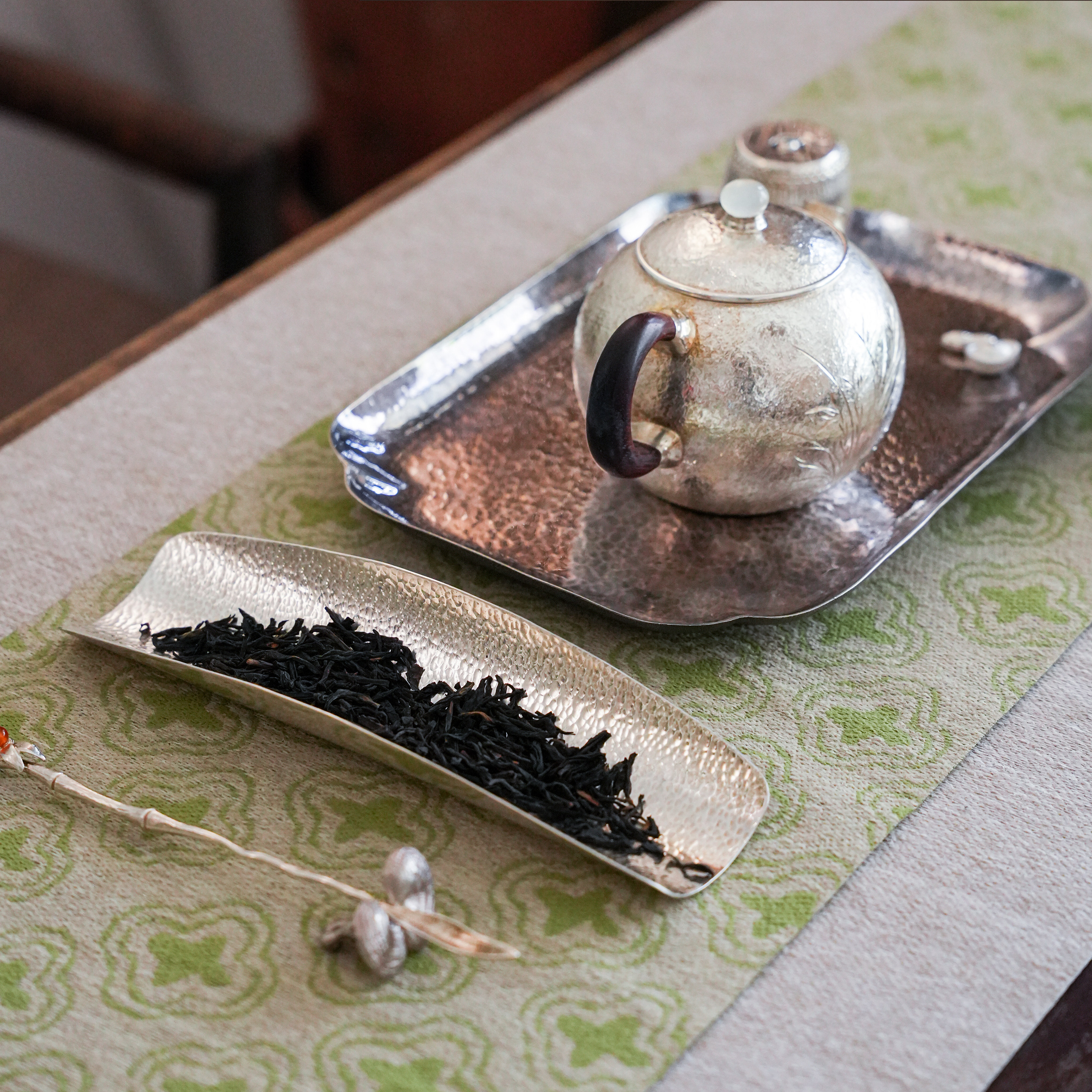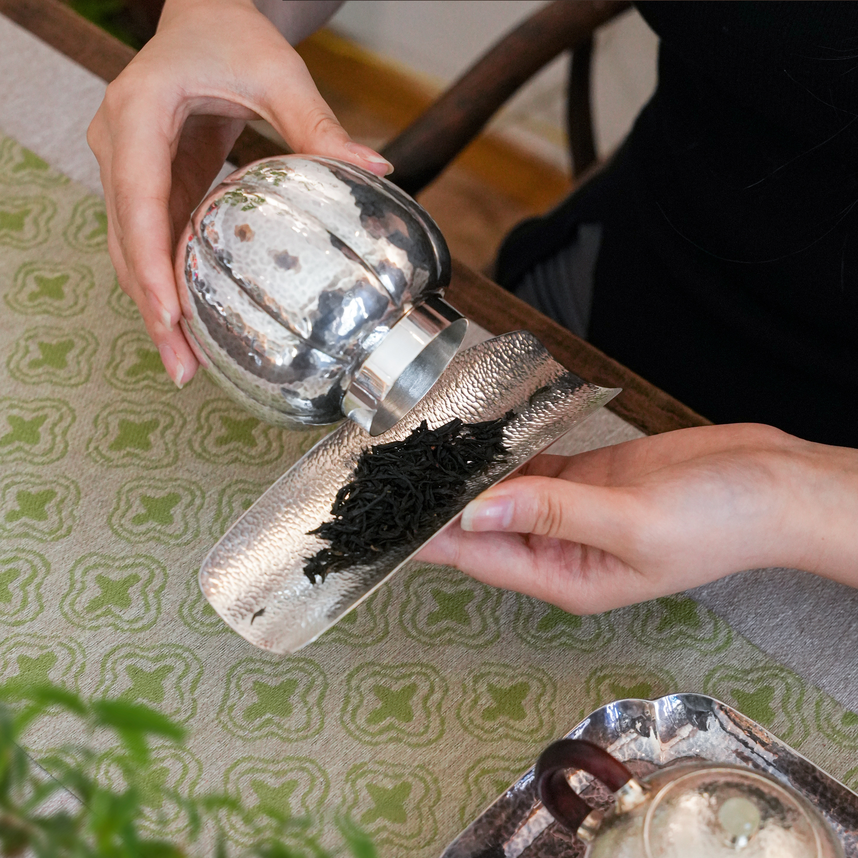 纯银时代 锤目纹茶则足银999纯手工做旧茶道茶荷简单精致赠12件套
