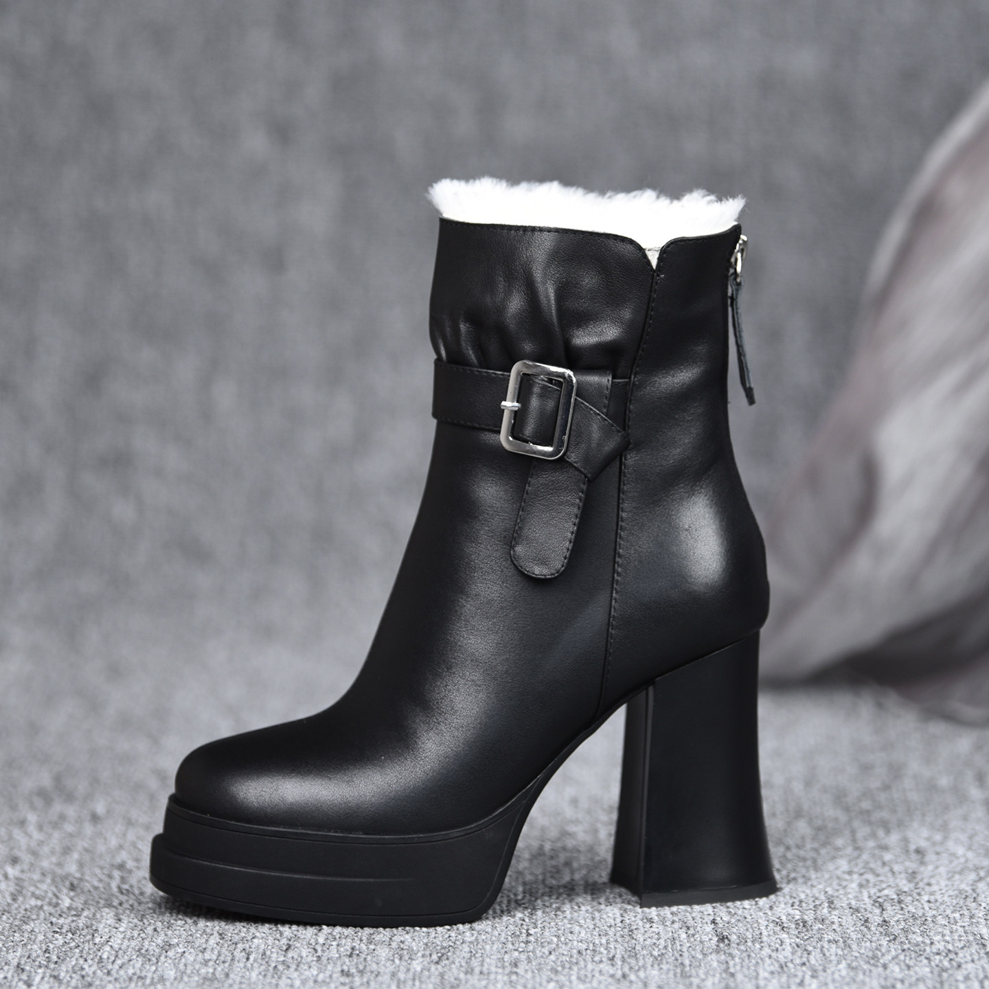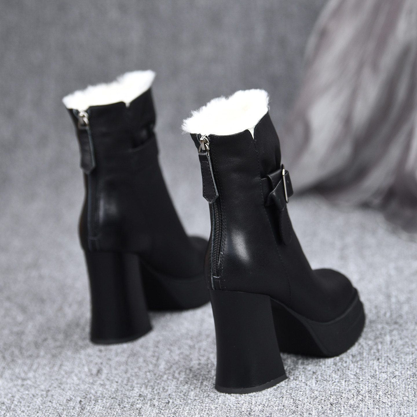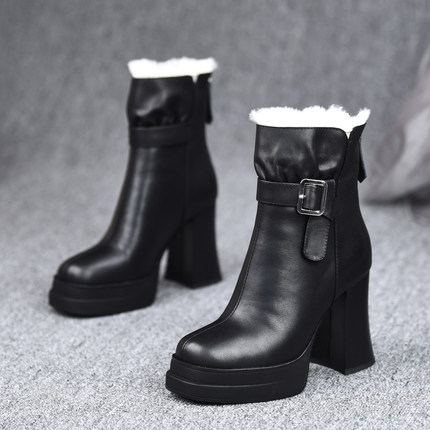 misili保暖粗跟短靴10cm高跟鞋2025秋冬季新款加绒厚底真皮女靴子