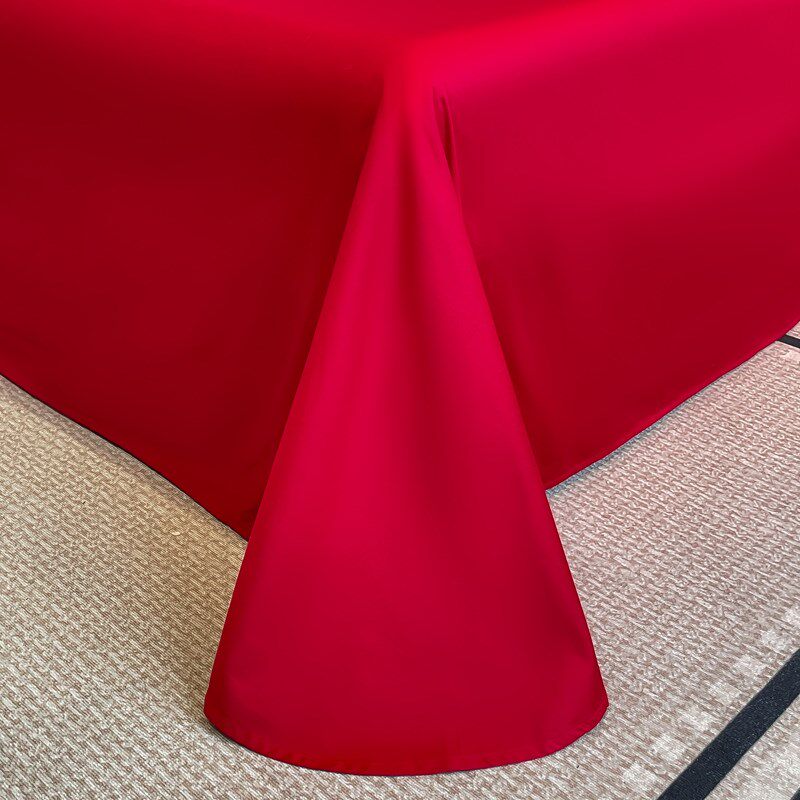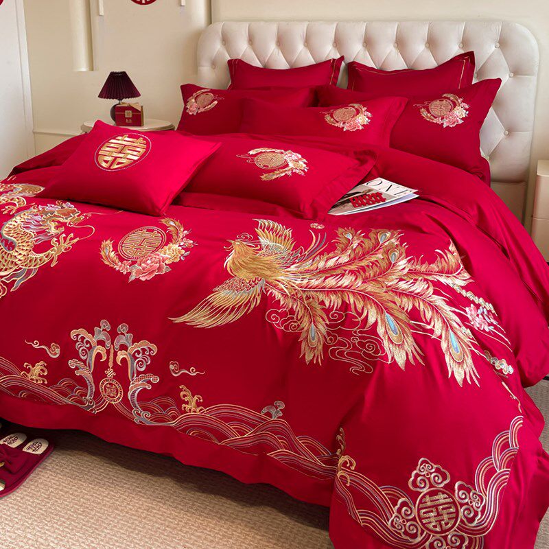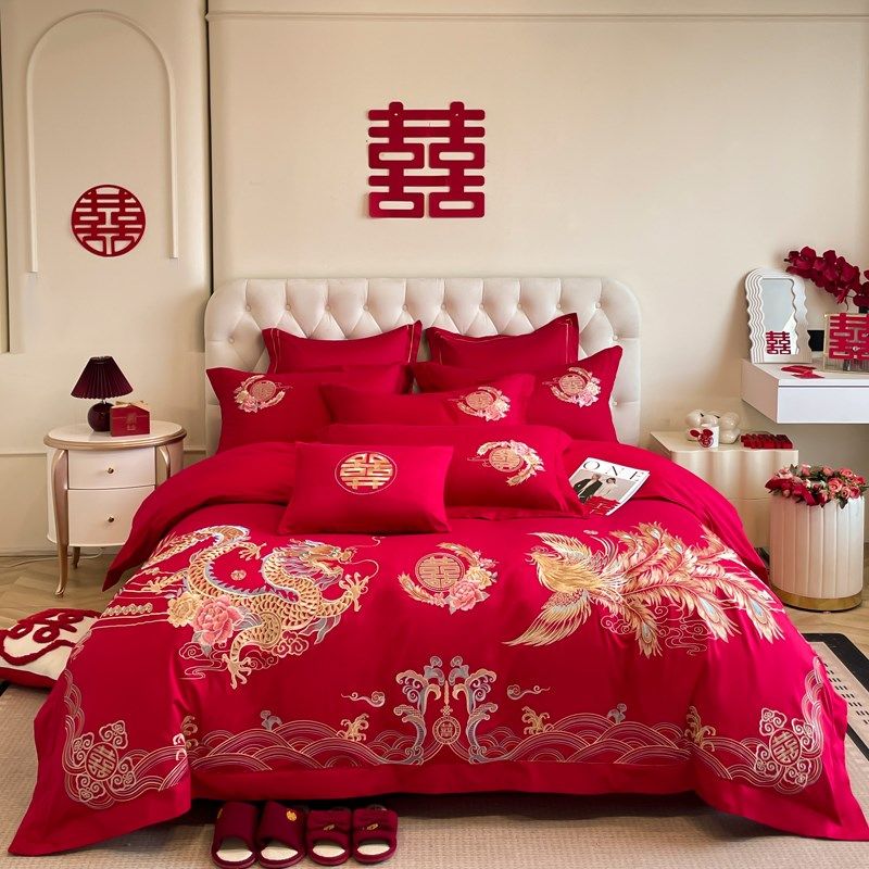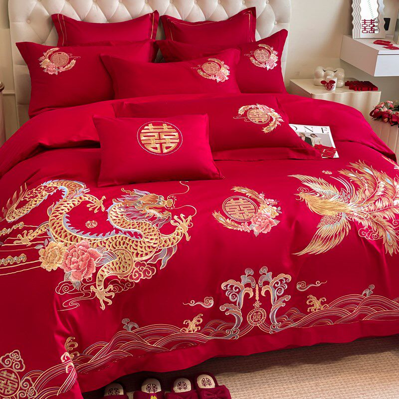 中式180支结婚四件套红色龙凤刺绣全棉被套床单婚庆床品4