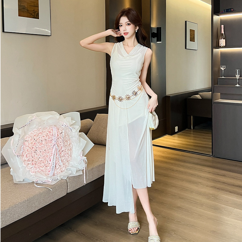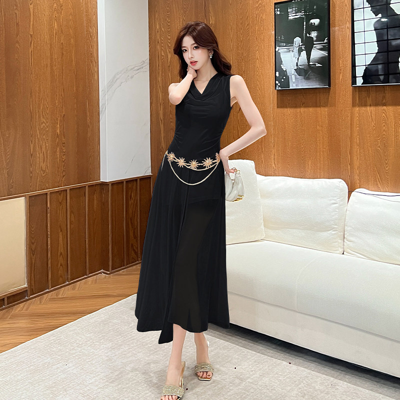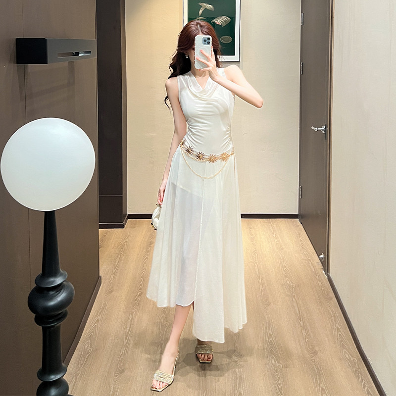 加小码XXXS150cm显高女装春季小个子挂脖收腰荡领连衣裙配腰链潮