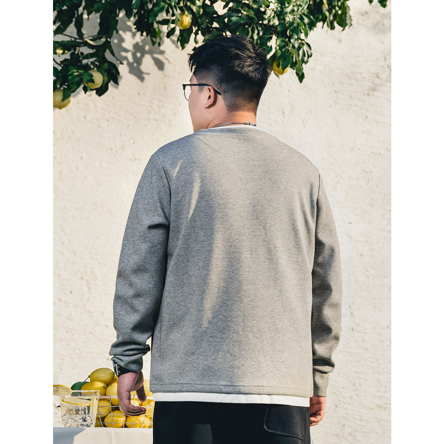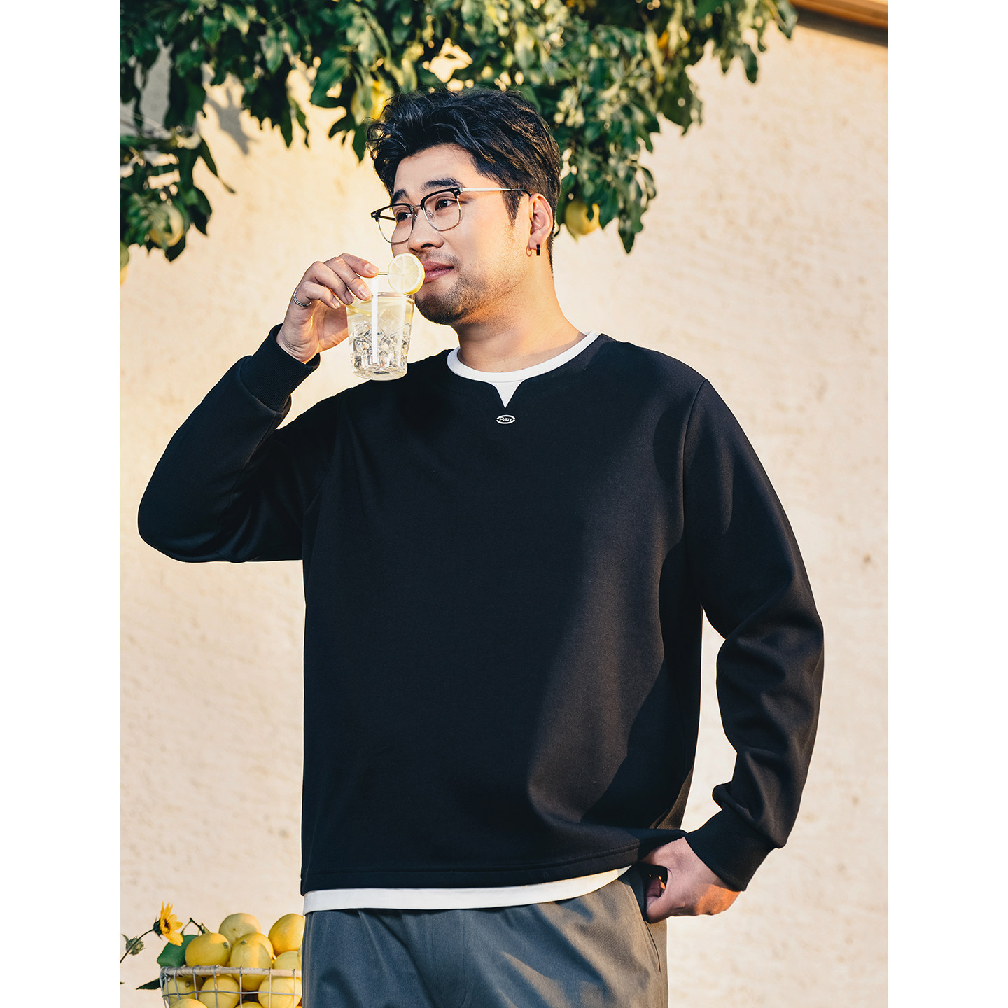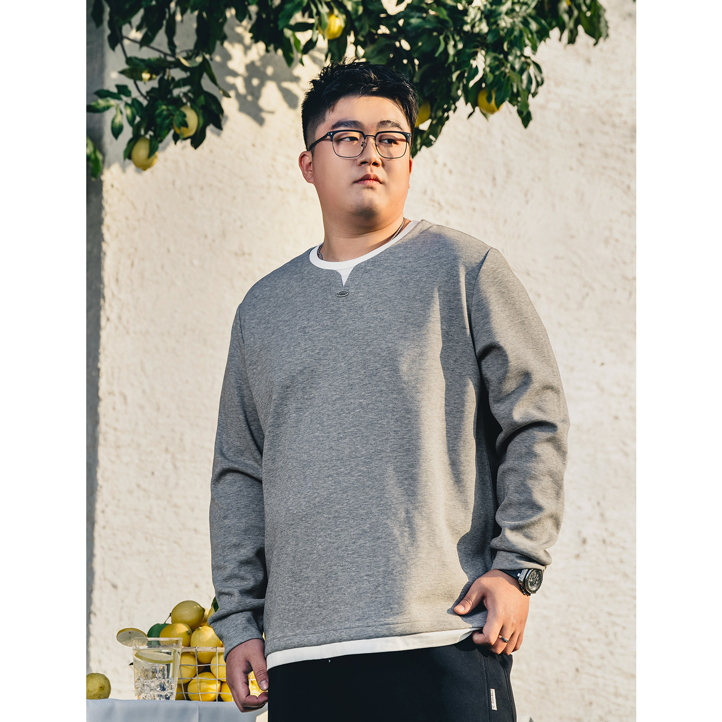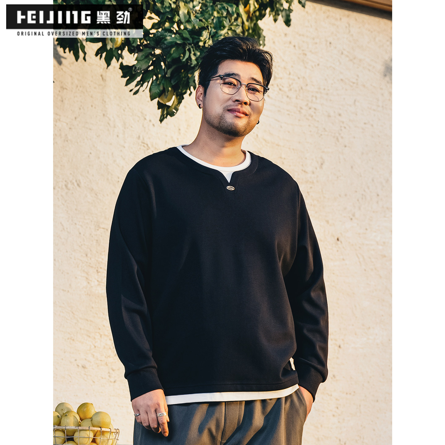 黑劲假两件胖子加大撞色圆领卫衣