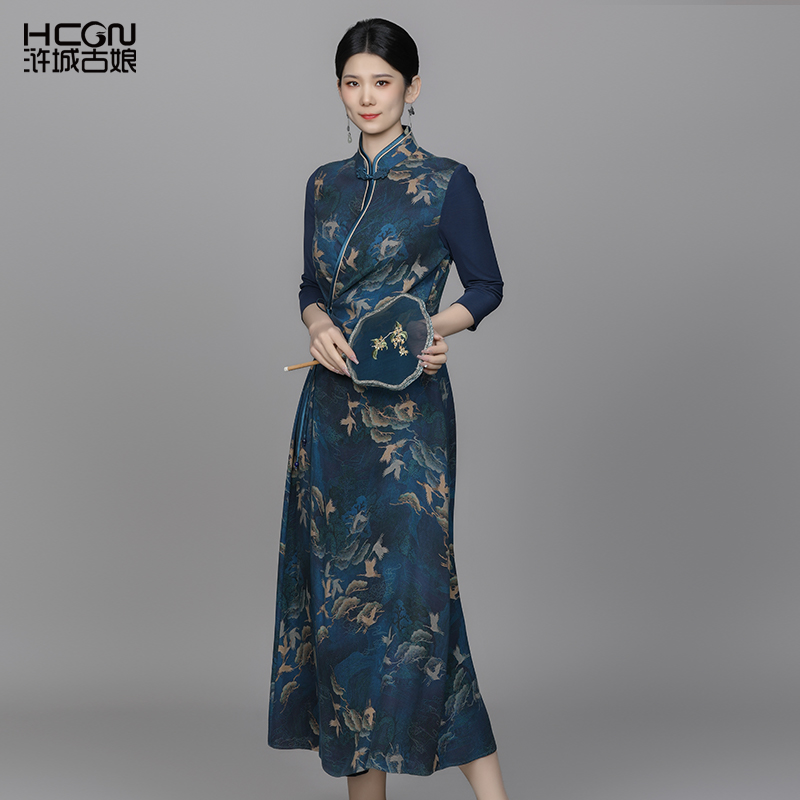 浒城古娘新款桑蚕丝印花复古立领长款香云纱新中式国风连衣裙女夏