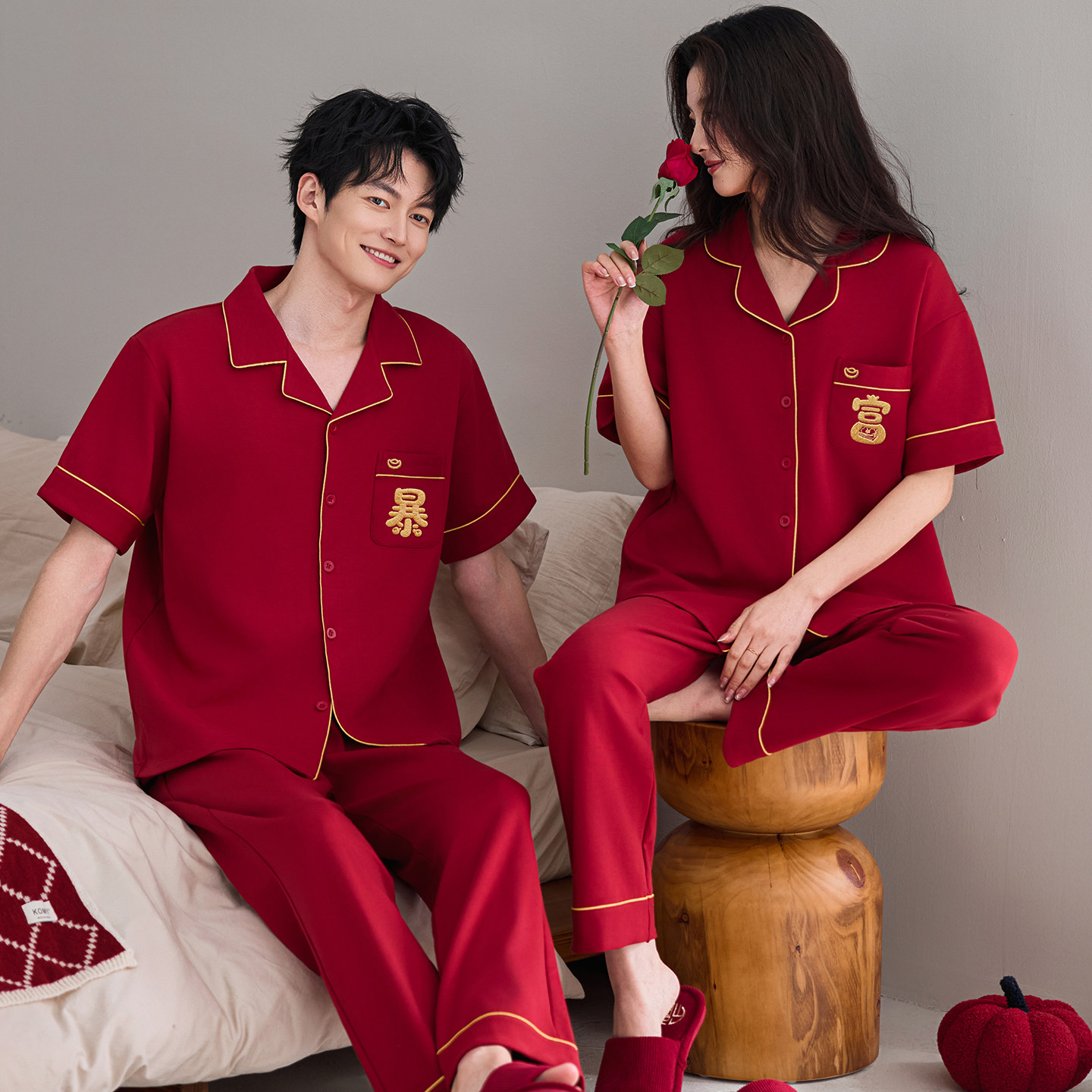 情侣睡衣春夏季纯棉结婚短袖长裤本命年红色男女220斤300斤6XL7XL