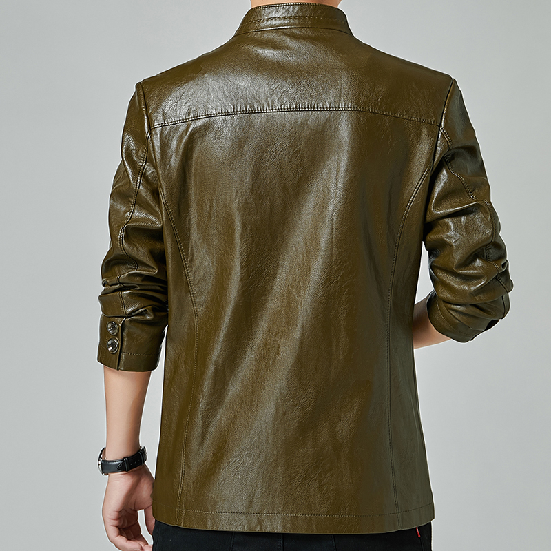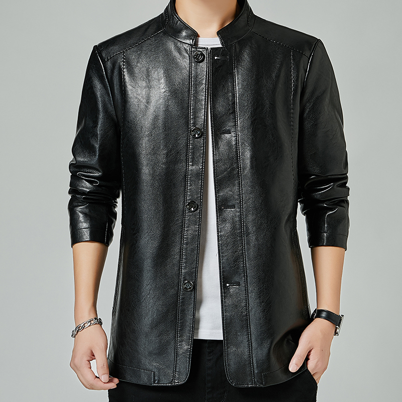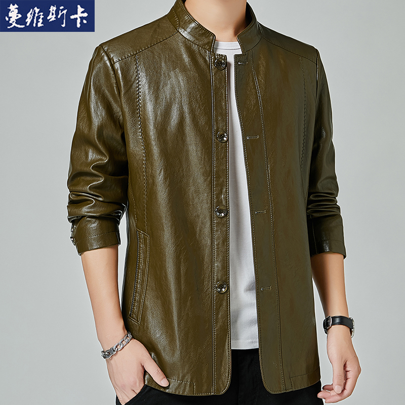 中国风男装复古立领皮衣男中山装宽松外套大尺码唐装商务中式皮夹