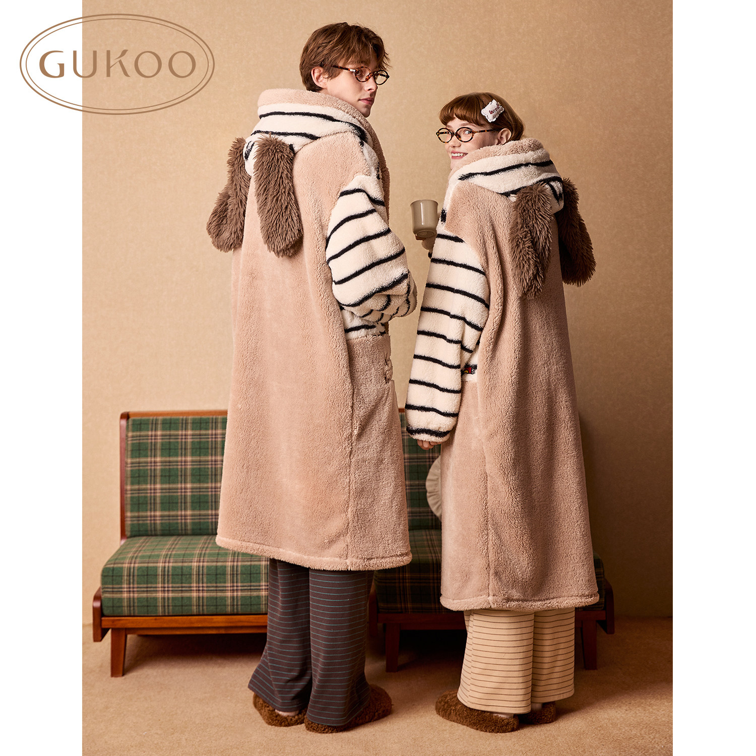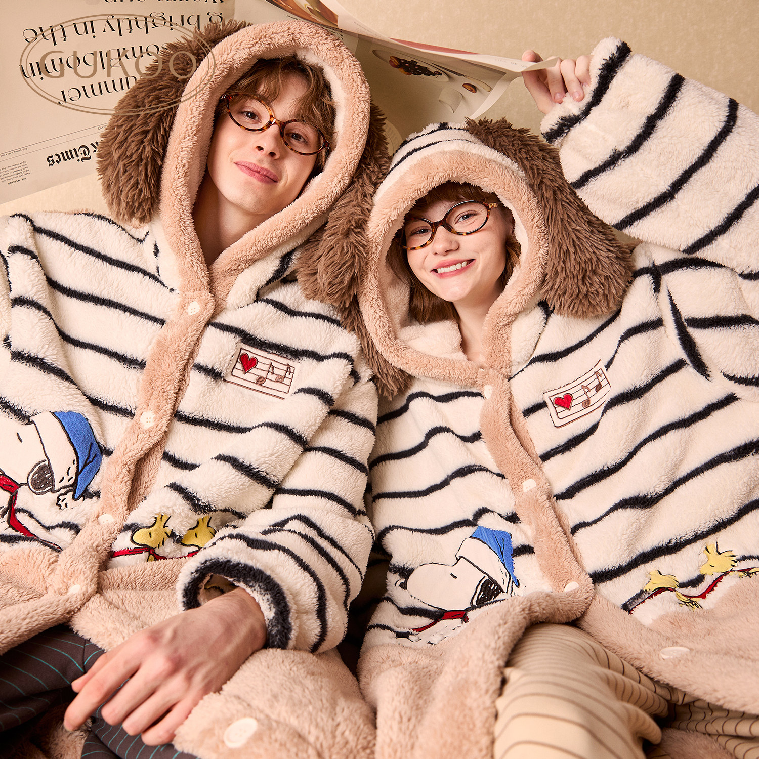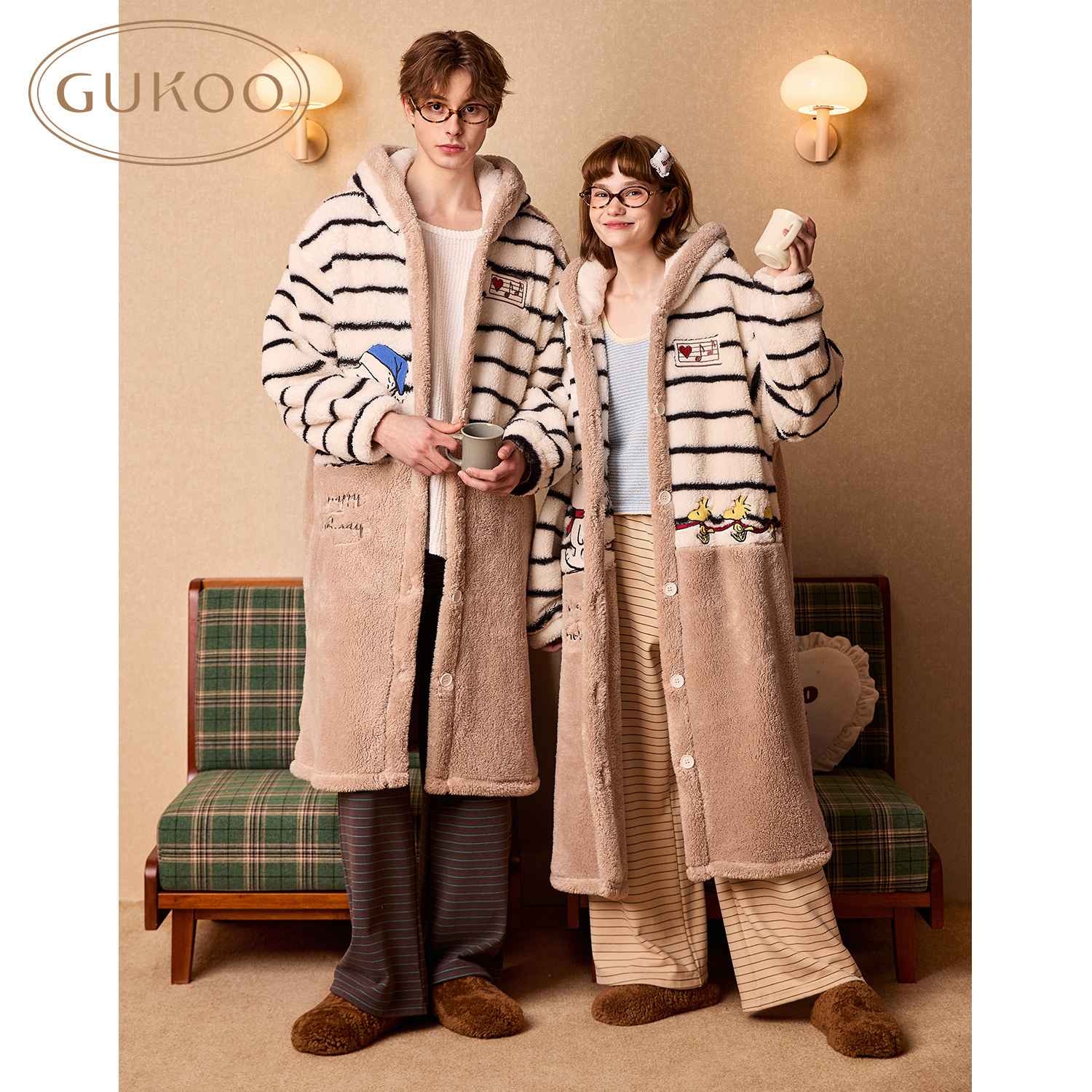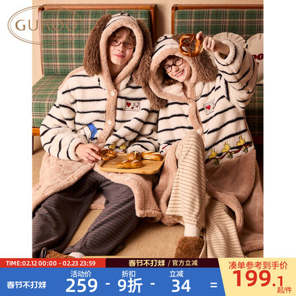 Gukoo/果壳情侣睡袍女冬季新款浴袍史努比珊瑚绒睡袍男款睡衣D