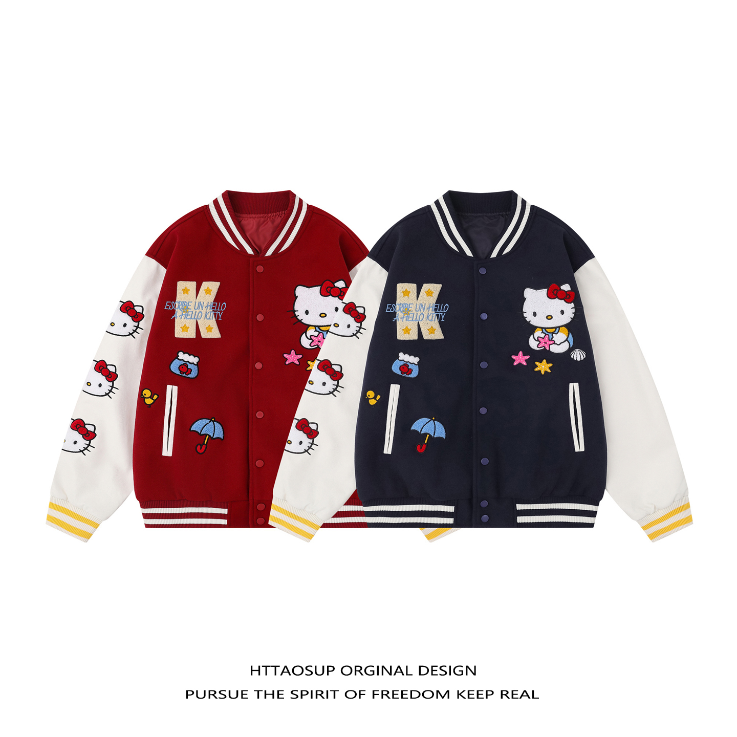 HTTAOSUP美式街头可爱Kitty猫棒球服男国潮刺绣宽松休闲情侣夹克