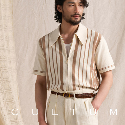 CULTUM复古条纹纯棉针织短袖开衫拉链POLO衫男休闲轻薄大翻领半袖
