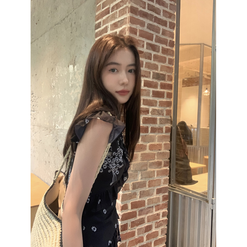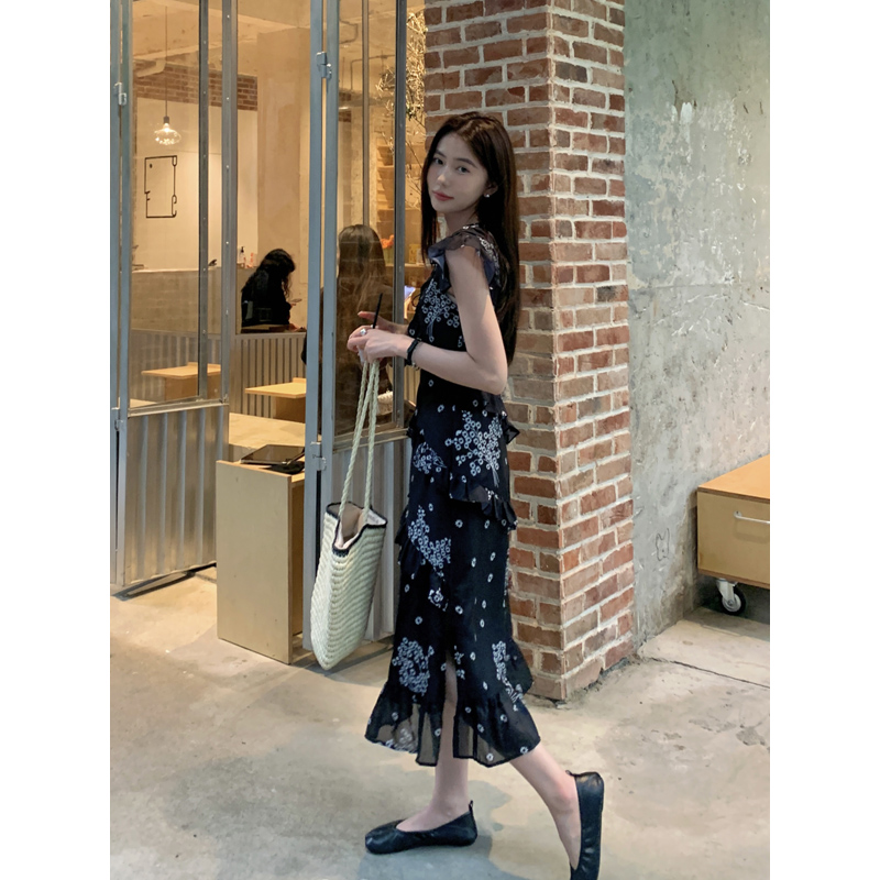 Halo Luu高级感黑色碎花连衣裙女夏季小飞袖法式收腰显瘦气质长裙