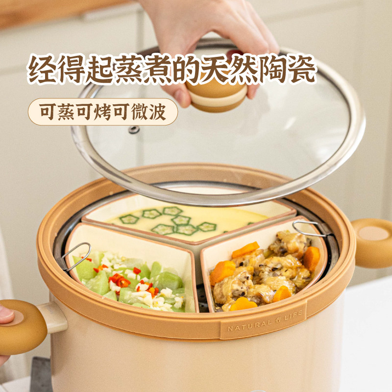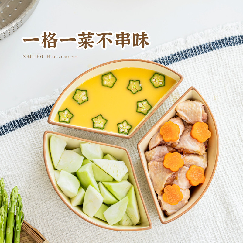 树可蒸碗扇形陶瓷三格食品级宝宝辅食一锅专用分格蒸菜蒸蛋碗蒸盘