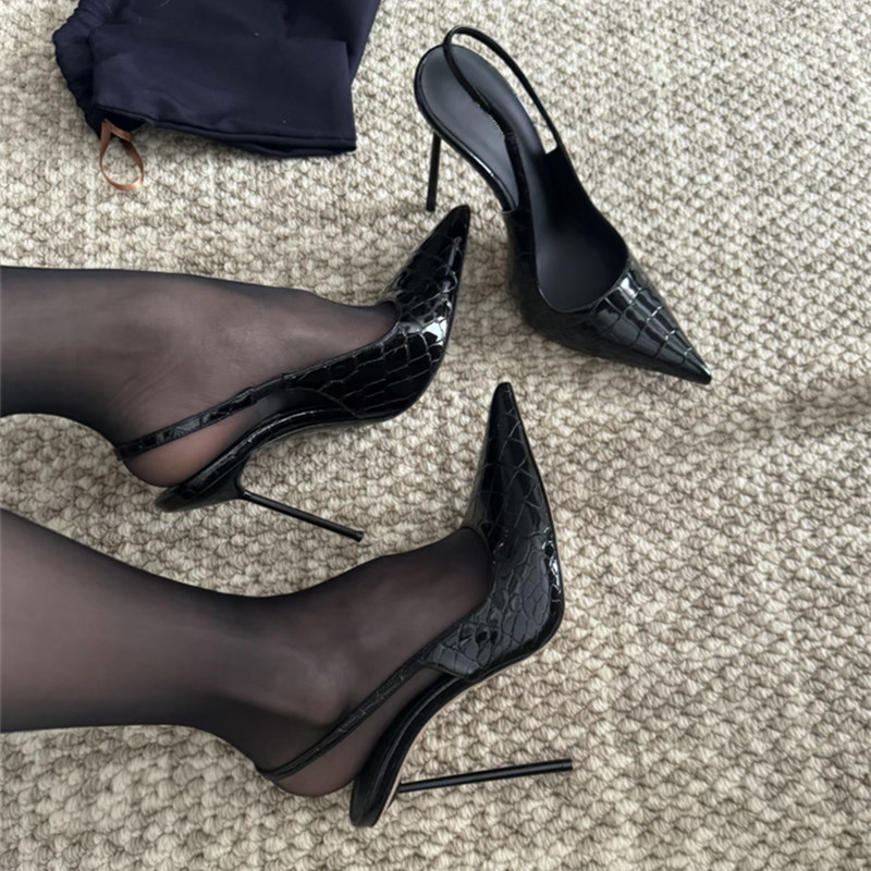 鳄鱼纹一字带包头凉鞋女细跟尖头辣妹性感夜店高跟鞋黑丝搭配单鞋