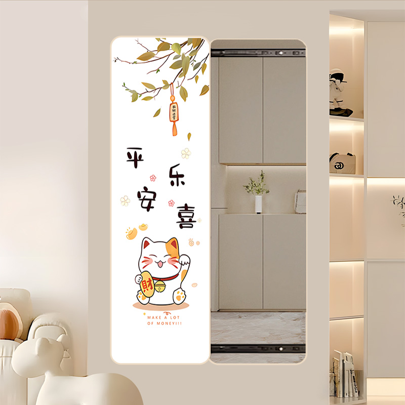 隐形推拉镜动漫装饰画壁挂全身镜卧室隐藏式穿衣镜暴富招财猫奶油