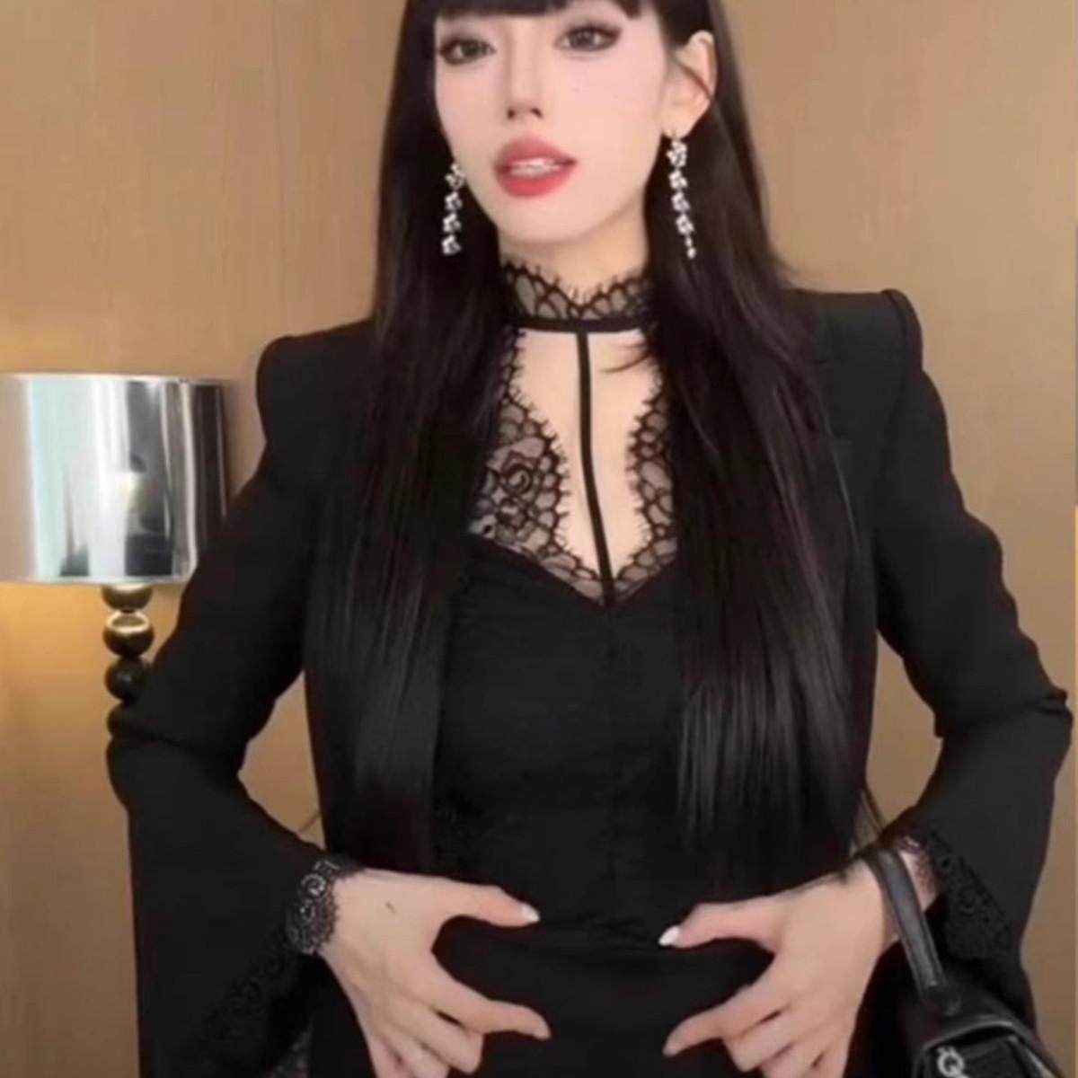 法式性感蕾丝钩花挂脖圆领长袖t恤女2025秋季新款气质修身上衣ins