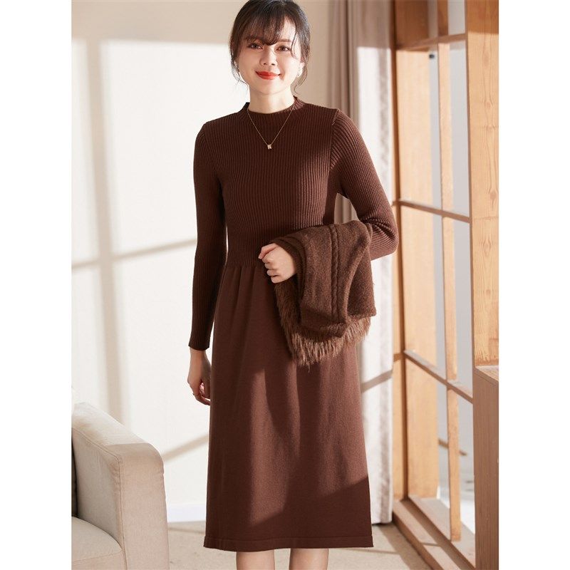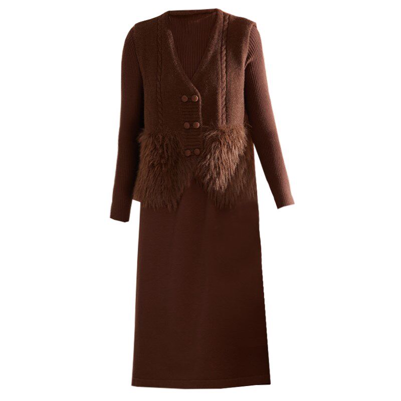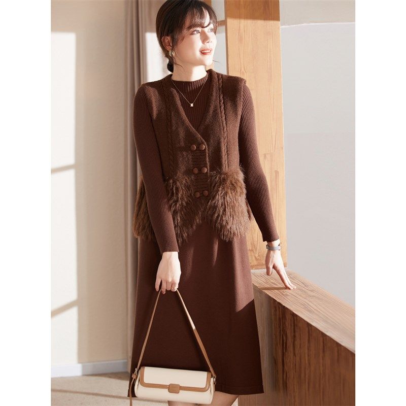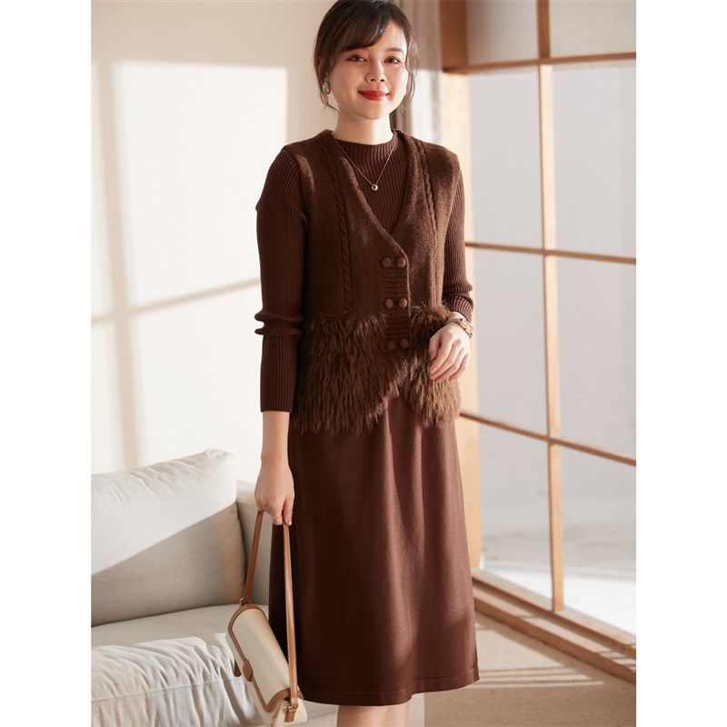 喜卉妈妈冬装新款连衣裙两件套中老年女装秋冬针织打底裙套装裙子