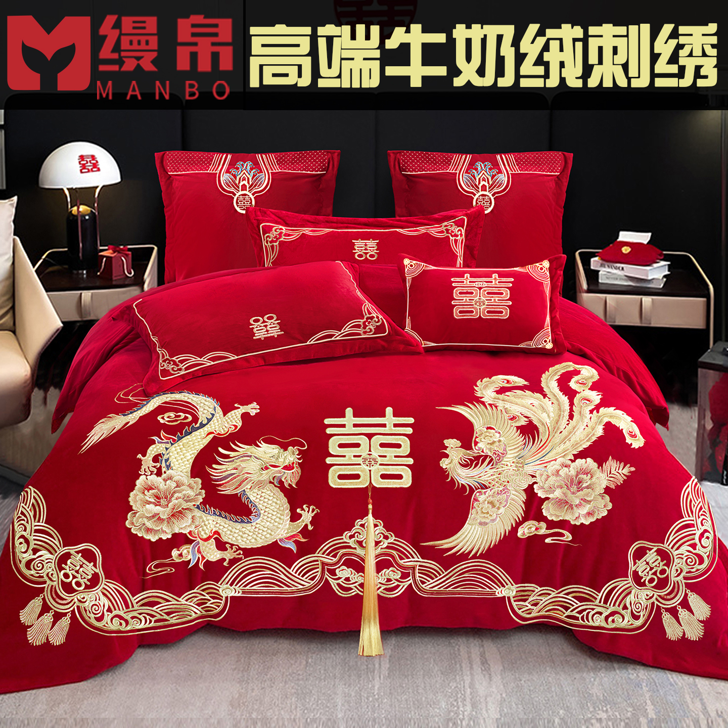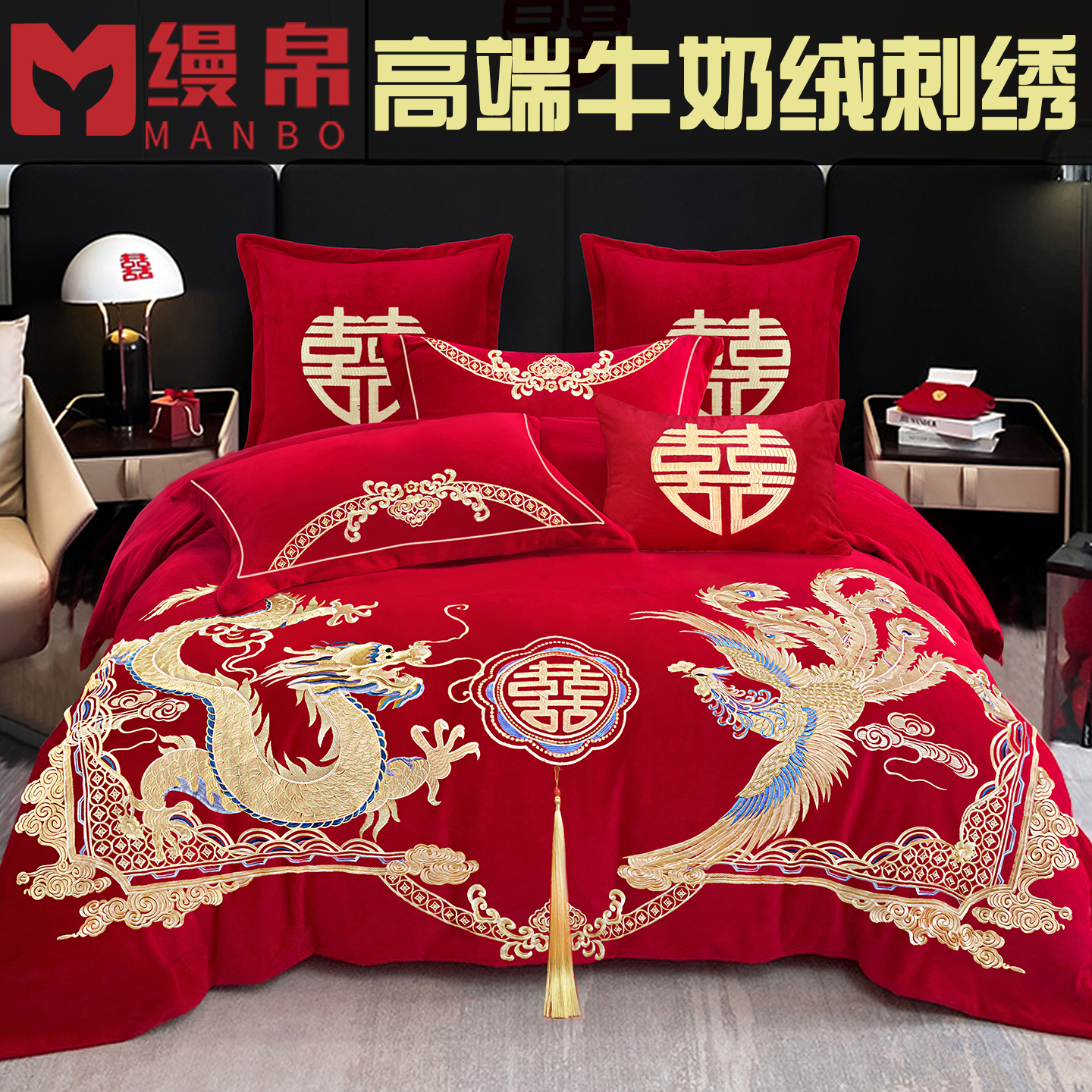 婚庆牛奶绒大红色四件套冬季结婚床上用品加绒加厚珊瑚绒床单被套