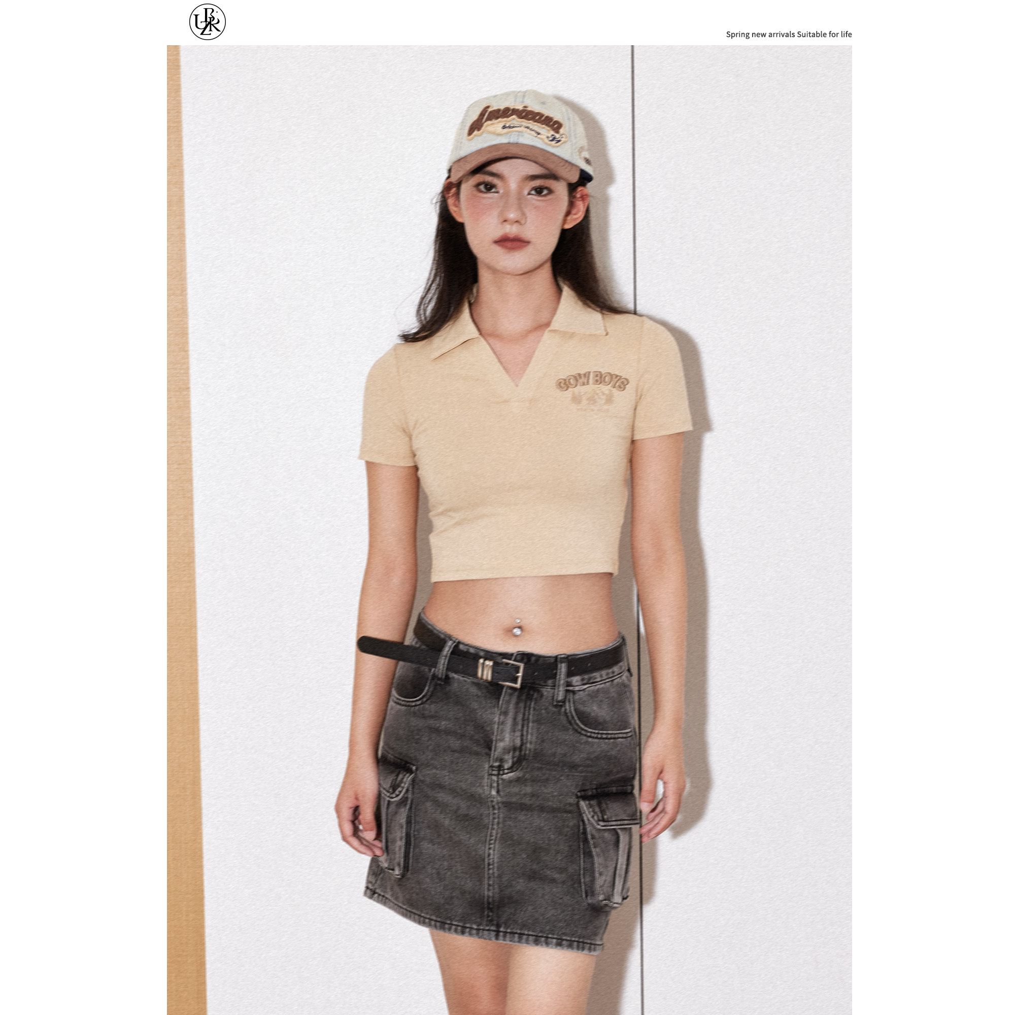 Beikastudios美式复古杏色短款T恤女短袖夏新款休闲V领POLO衫