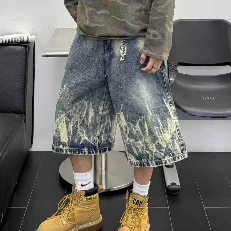 美式复古闪电纹扎花牛仔七分短裤过膝休闲中裤阔腿短裤男女潮牌