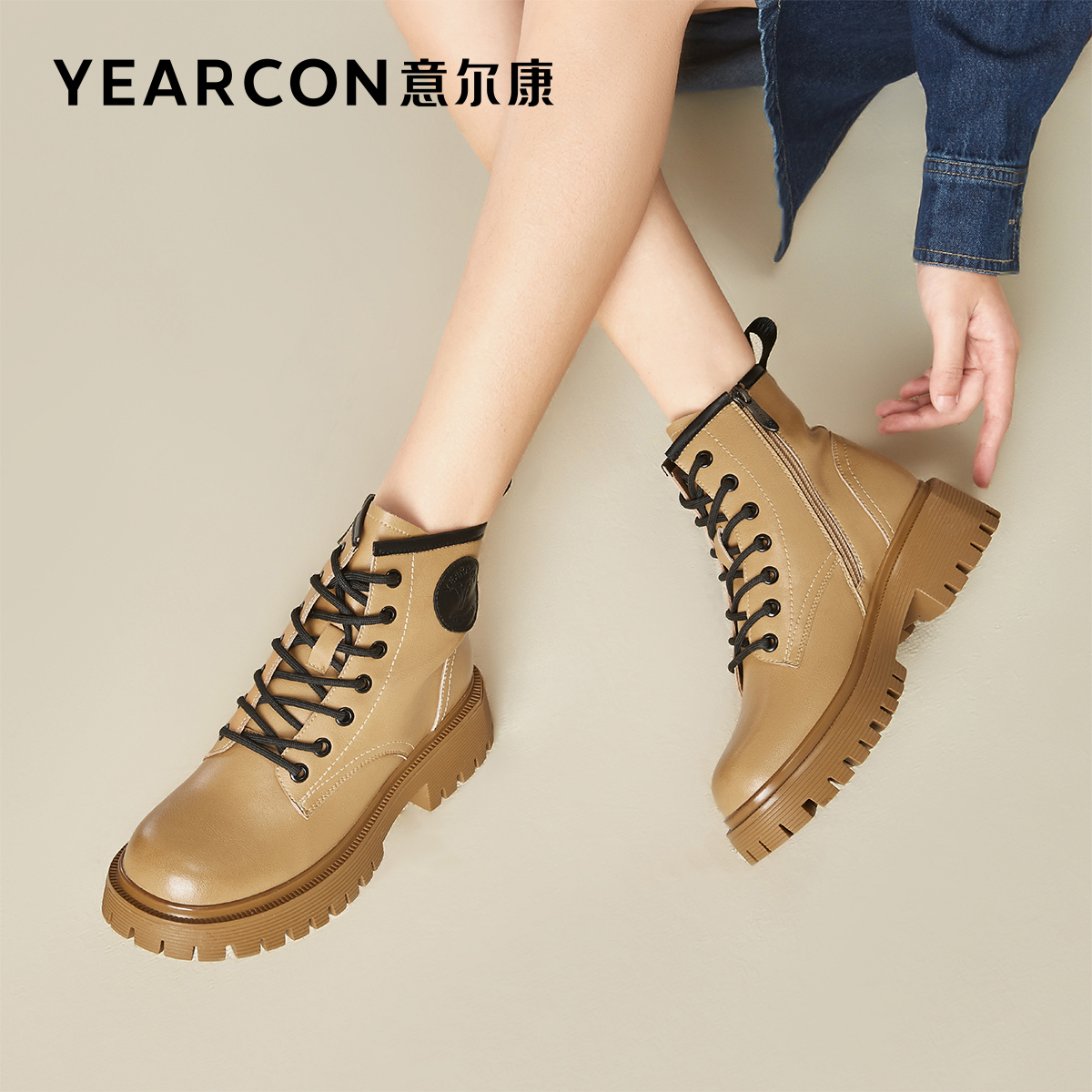 意尔康女鞋冬季复古户外休闲加绒马丁靴粗跟英伦风短靴小个子女士