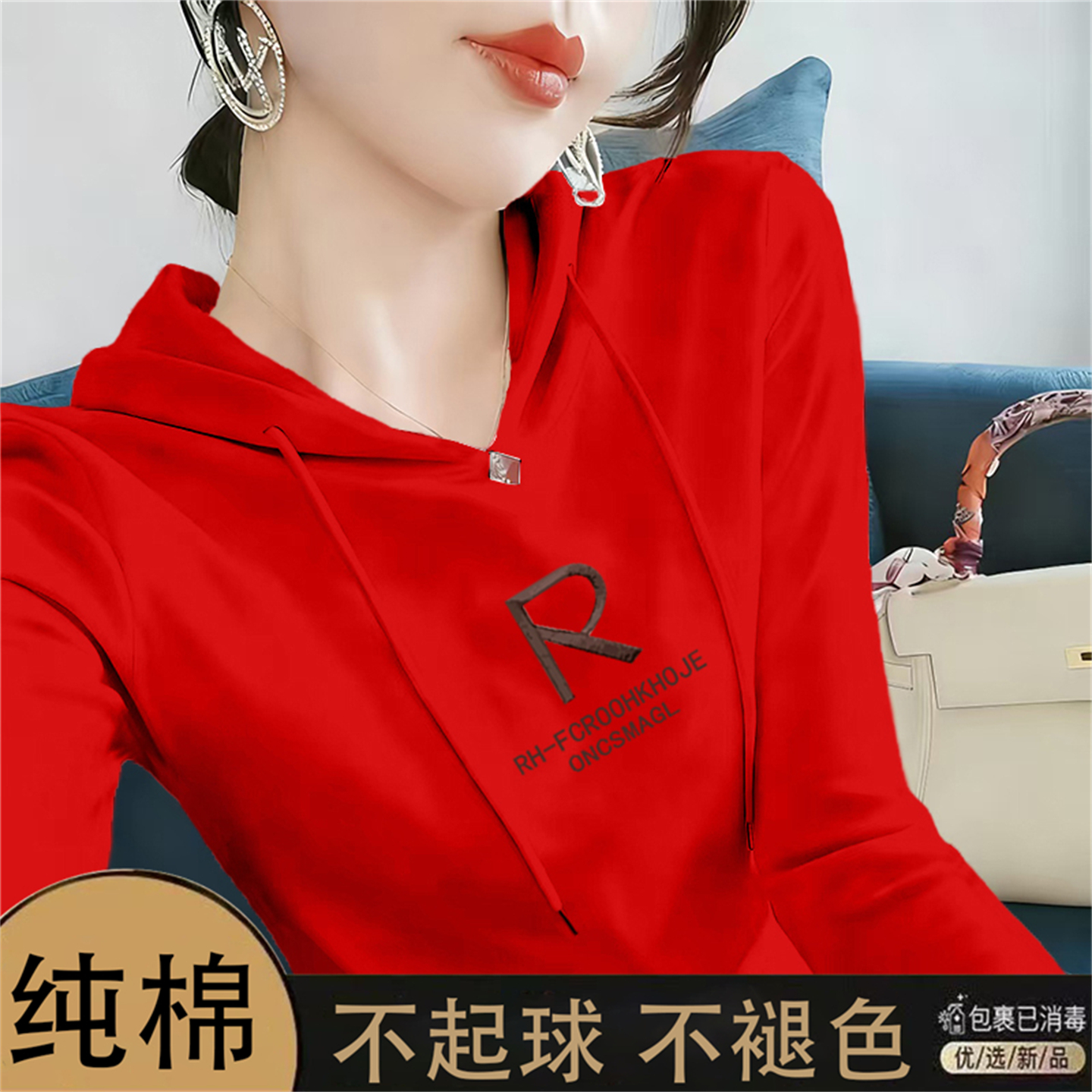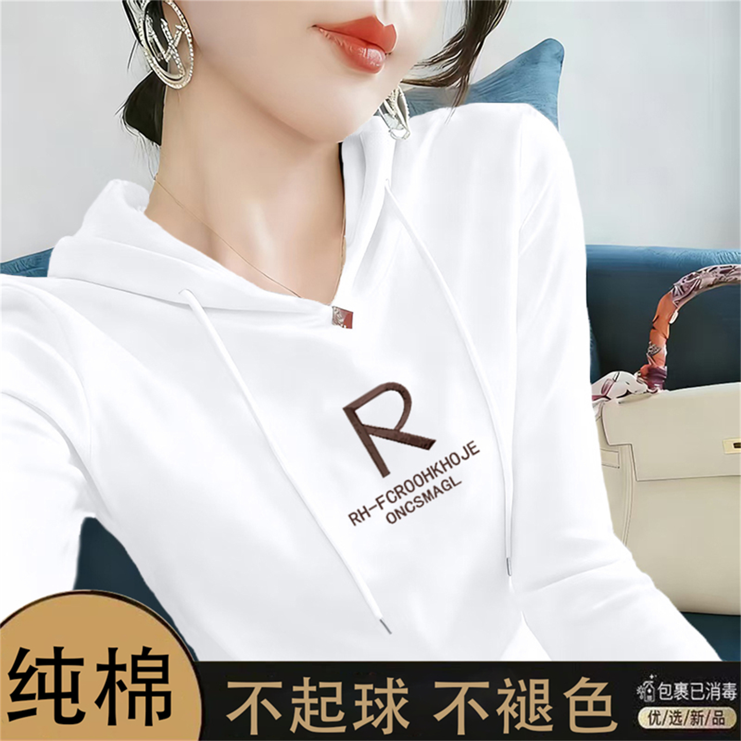 纯棉连帽卫衣女装2025新款时尚韩版长袖T恤宽松百搭带帽修身上衣