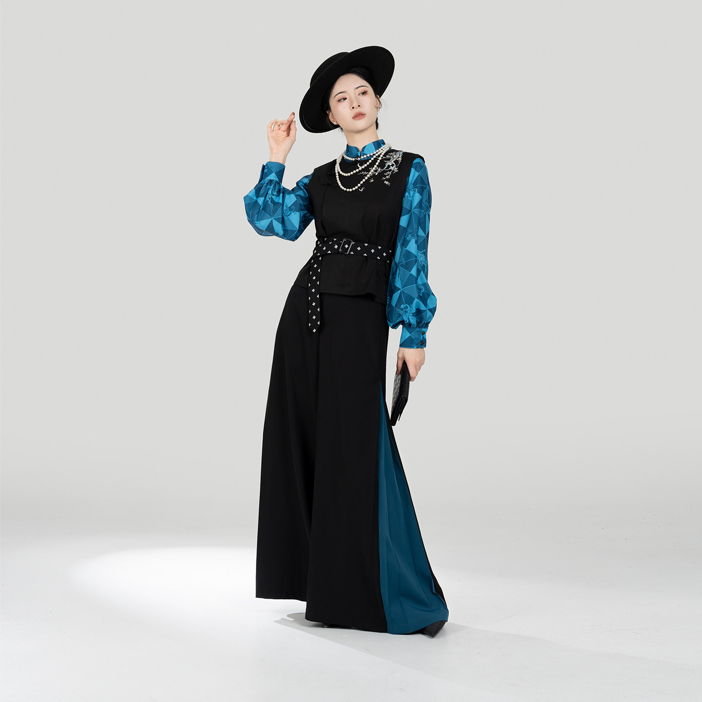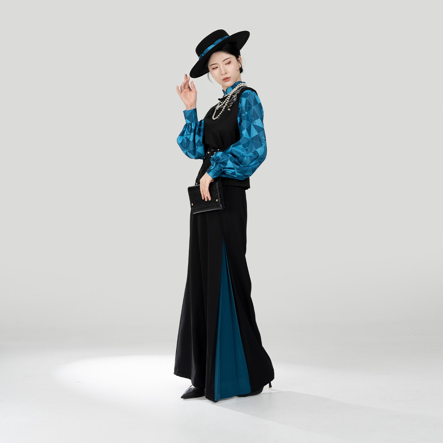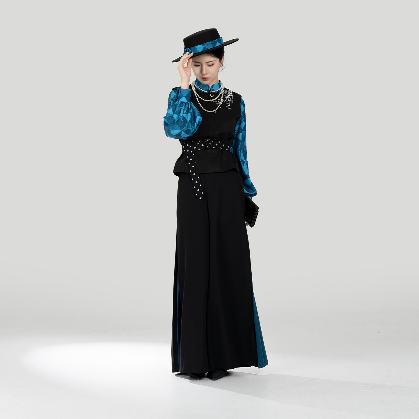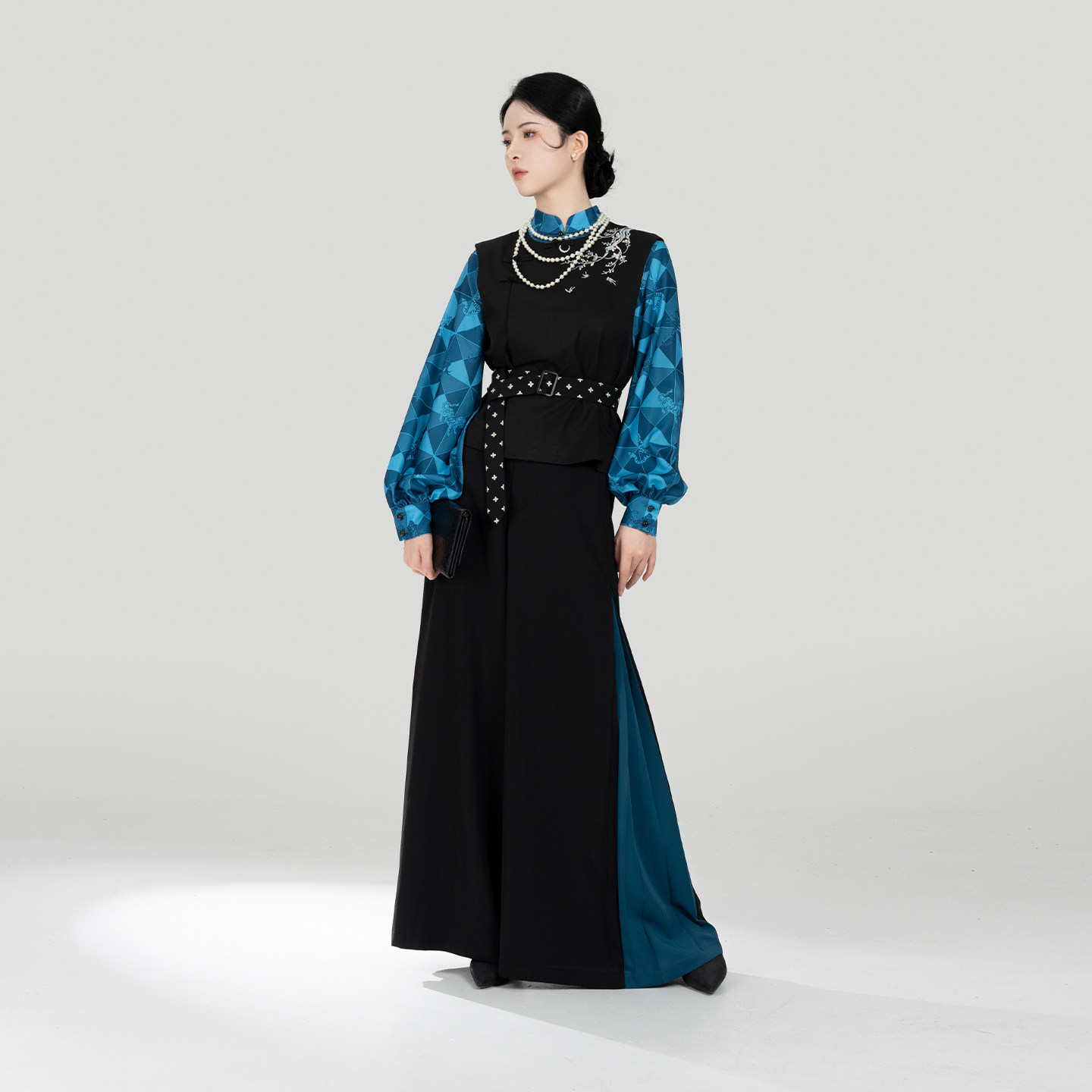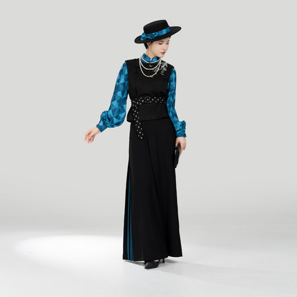 织造司[落梅引]新中式五毒水田纹绣花马甲立领衬衫改良宋裤阔腿裤