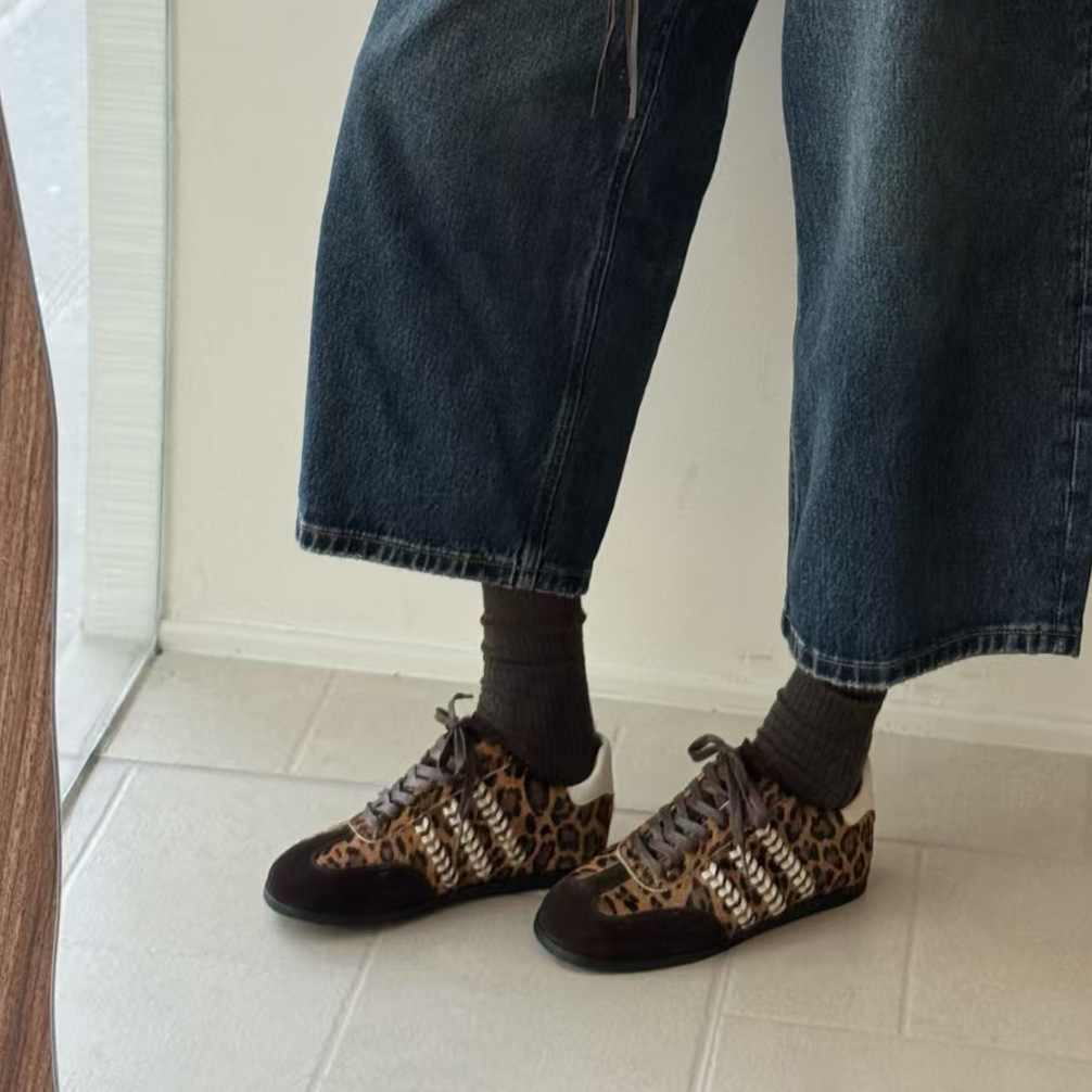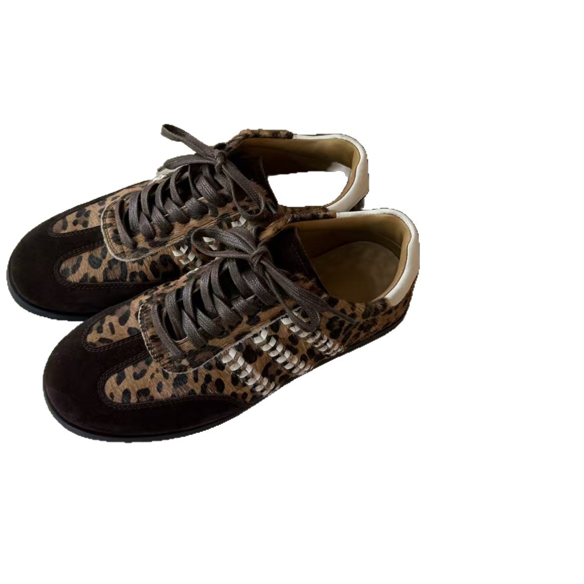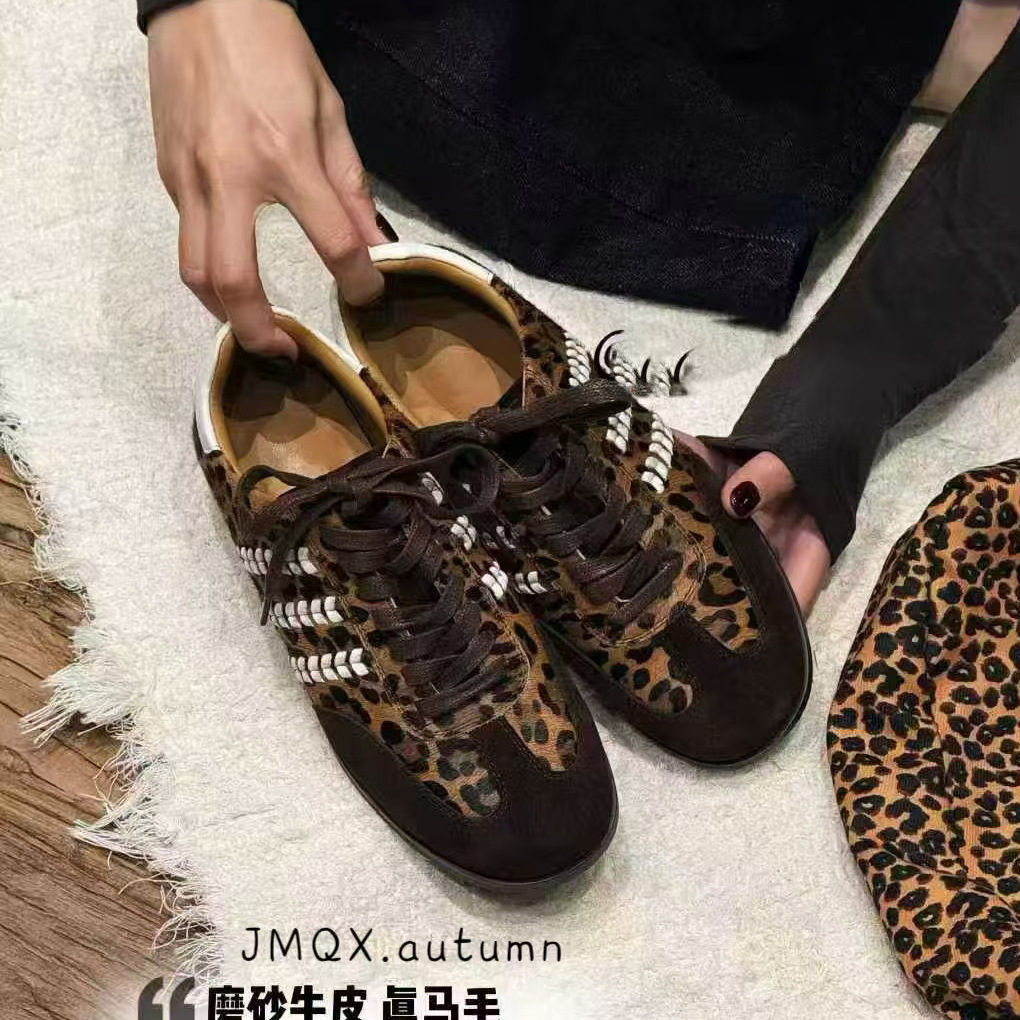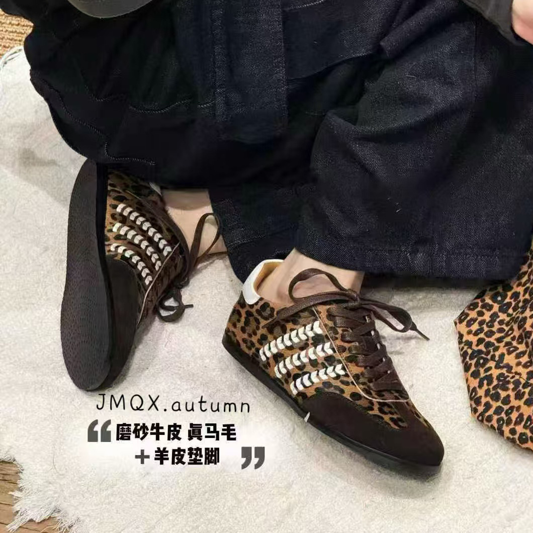 欧货女鞋2025秋季真皮平底豹纹马毛德训鞋复古英伦风休闲运动板鞋