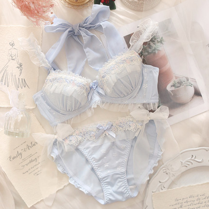 约素日系少女内衣可爱清新蓝挂脖聚拢大胸显小有钢圈大码文胸套装