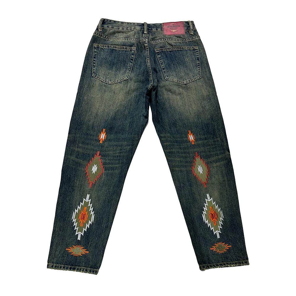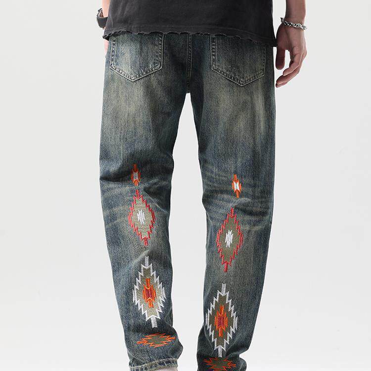 锥形水洗复古刺绣牛仔裤男