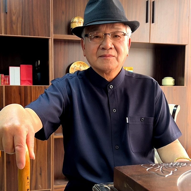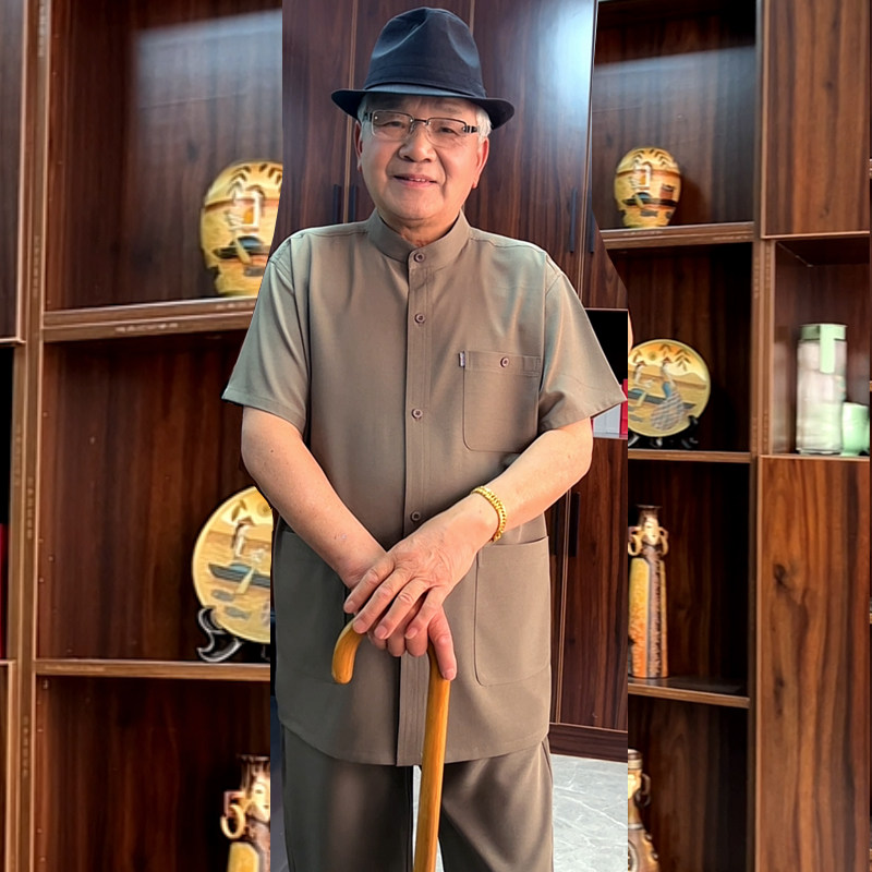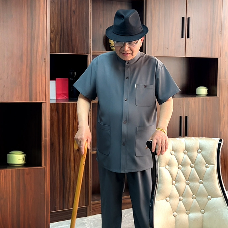 爸爸薄款短袖套装男中老年立领衬衫扣子唐装老人宽松衬衣爷爷夏季