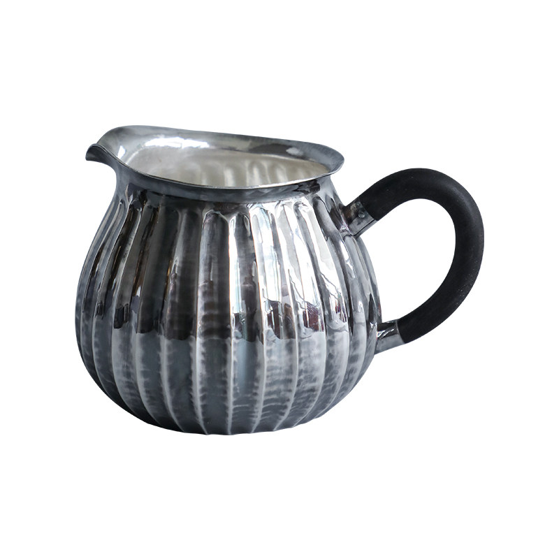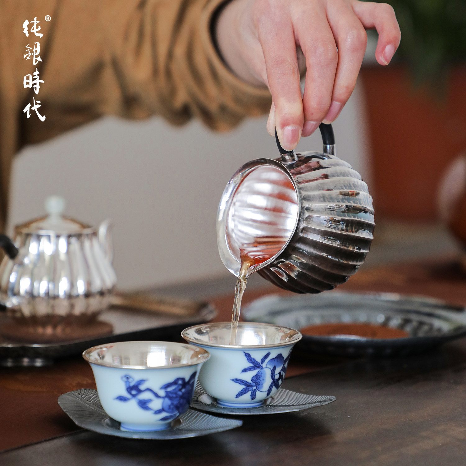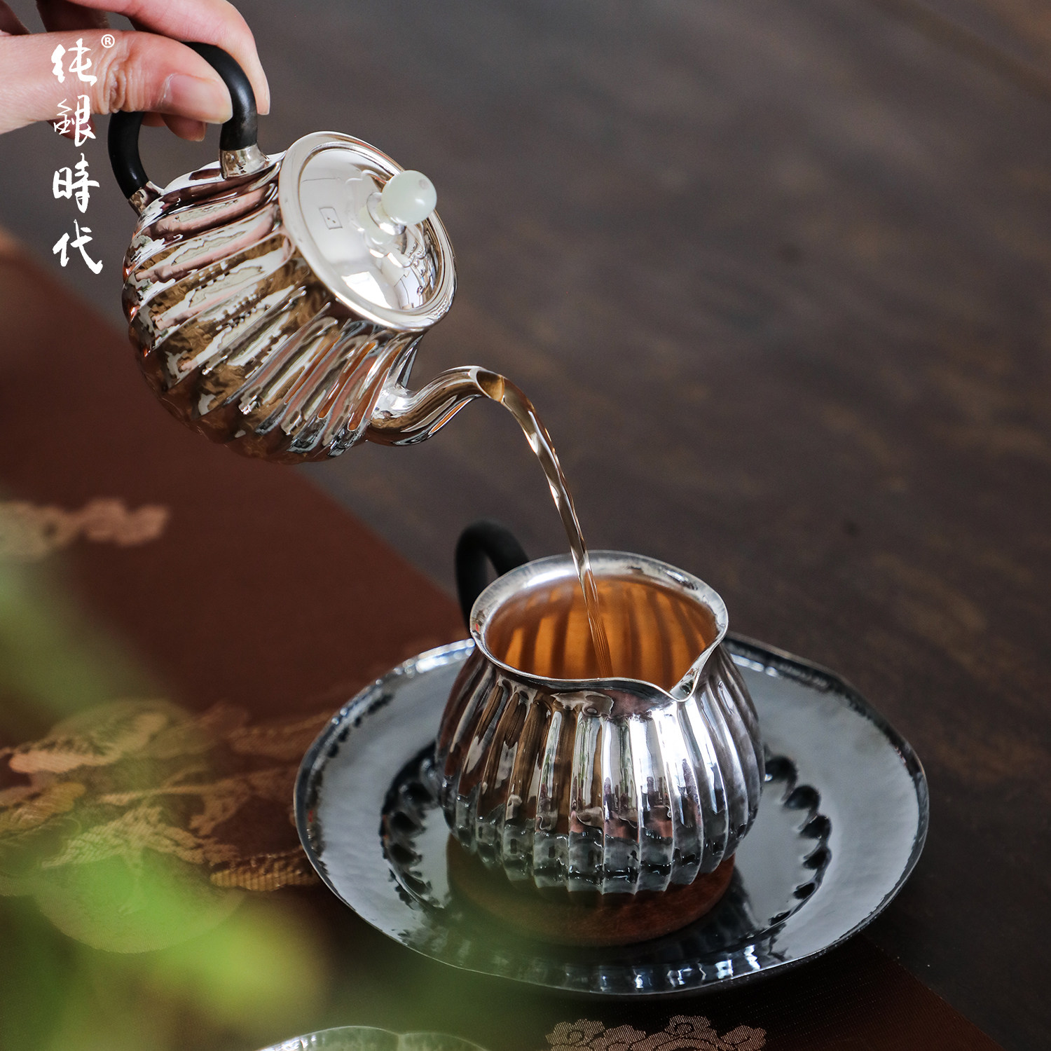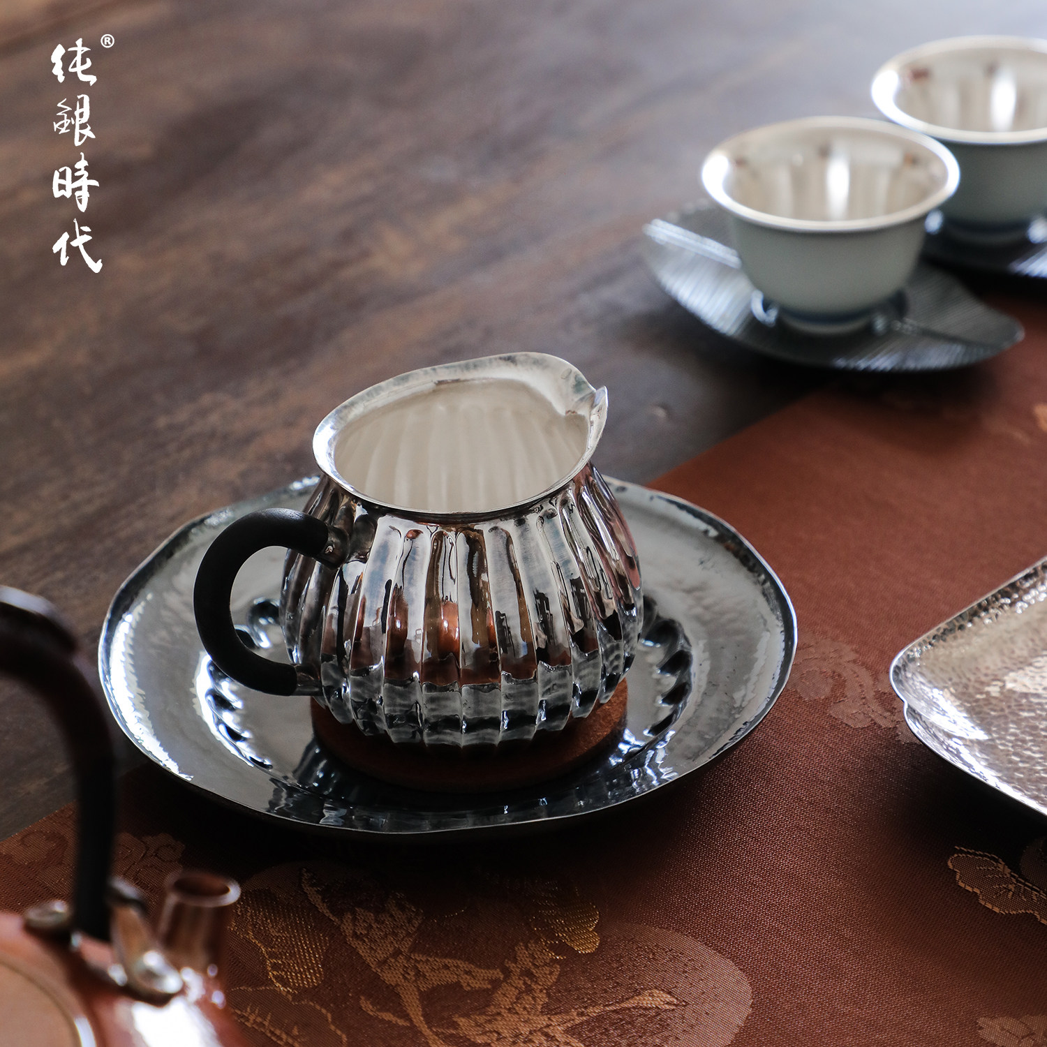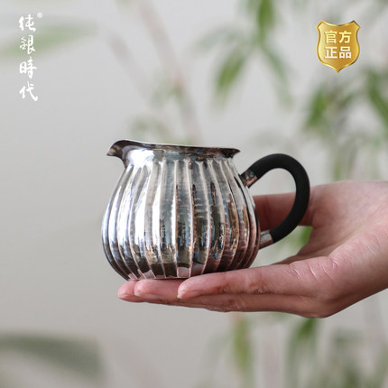 纯银时代 菊瓣公道杯足银999手工一张打防烫木把匀杯分茶器220ml