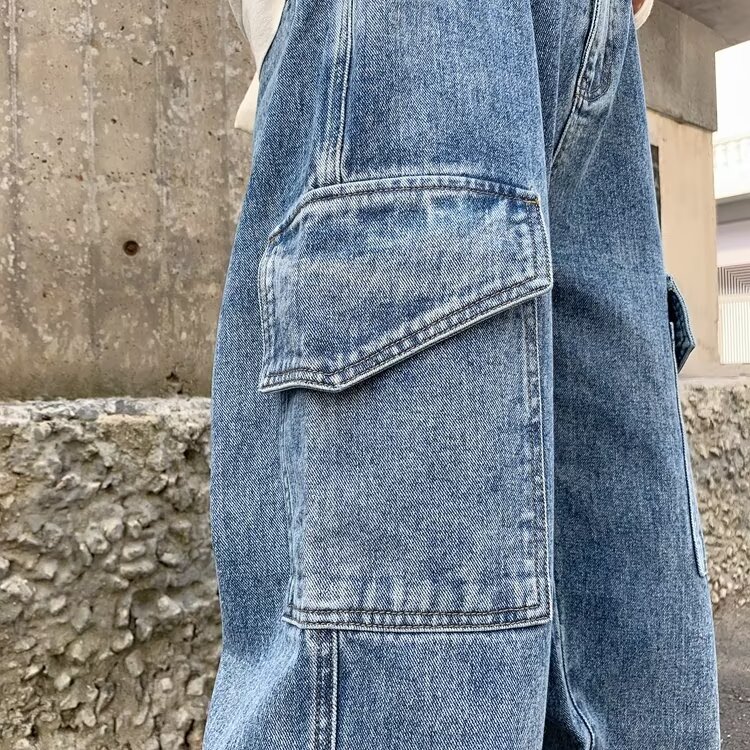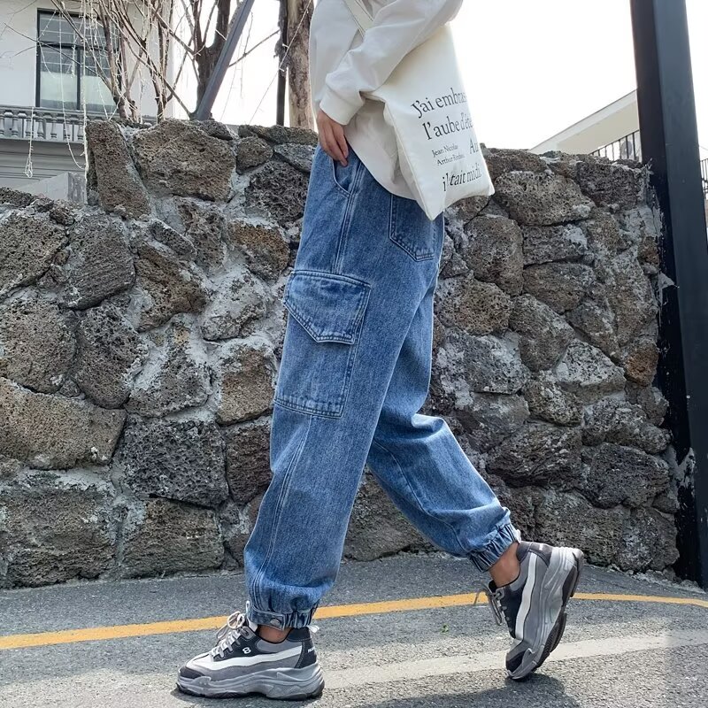 哈伦松紧腰束脚工装牛仔裤女春秋新款大码胖mm百搭多口袋九分长裤
